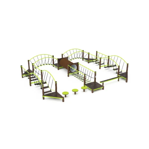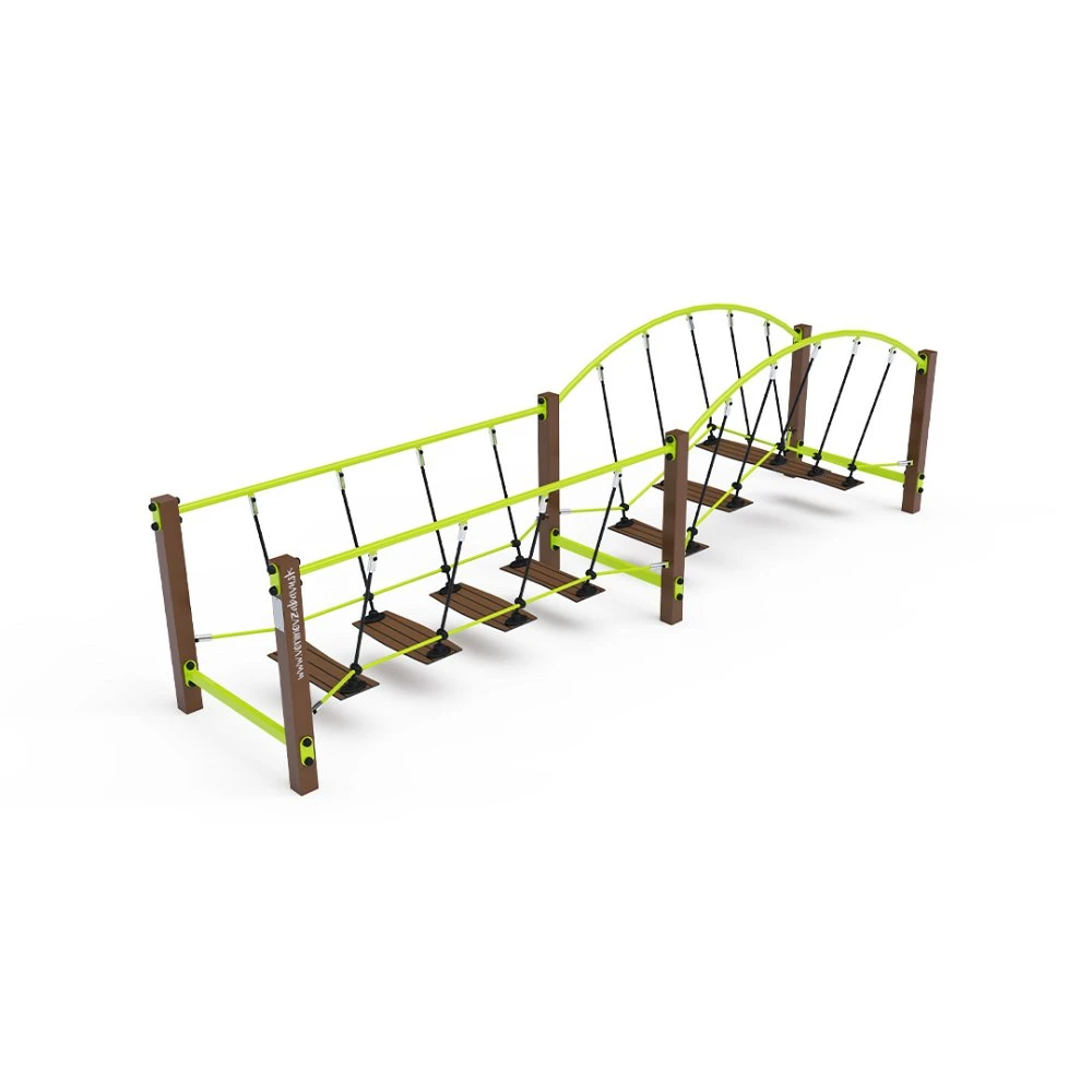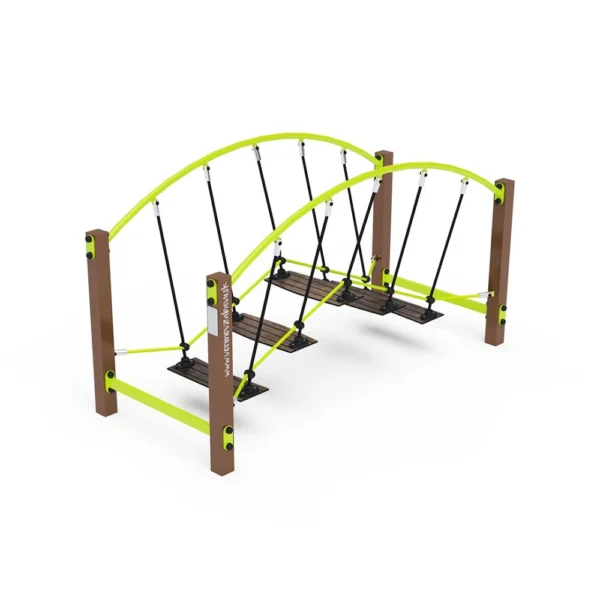 Kombinirani most za ravnotežu bez održavanja s HPL protukliznim gazištima, obješen na poliesterskim užadima, element je igrališta osmišljen za djecu kako bi razvila koordinaciju, stabilnost i ravnotežu. Izrađen je od vruće pocinčanog čelika, premazanog praškasto pečenom bojom za trajnost. Užad su izrađena od poliesterskih vlakana namotanih oko jezgre, što povećava njihovu čvrstoću i otpornost na mehanička naprezanja. Sam poliester nudi mnoge pozitivne kvalitete: otporan je na mikroorganizme, vremenske uvjete, brzo se suši nakon kiše, postojan je u boji i poznat je po svojoj visokoj čvrstoći. Za montažu se koriste spojnice od nehrđajućeg čelika. Iako travnata površina može poslužiti kao udarna površina, preporučujemo korištenje prostirke za ojačanje travnjaka.