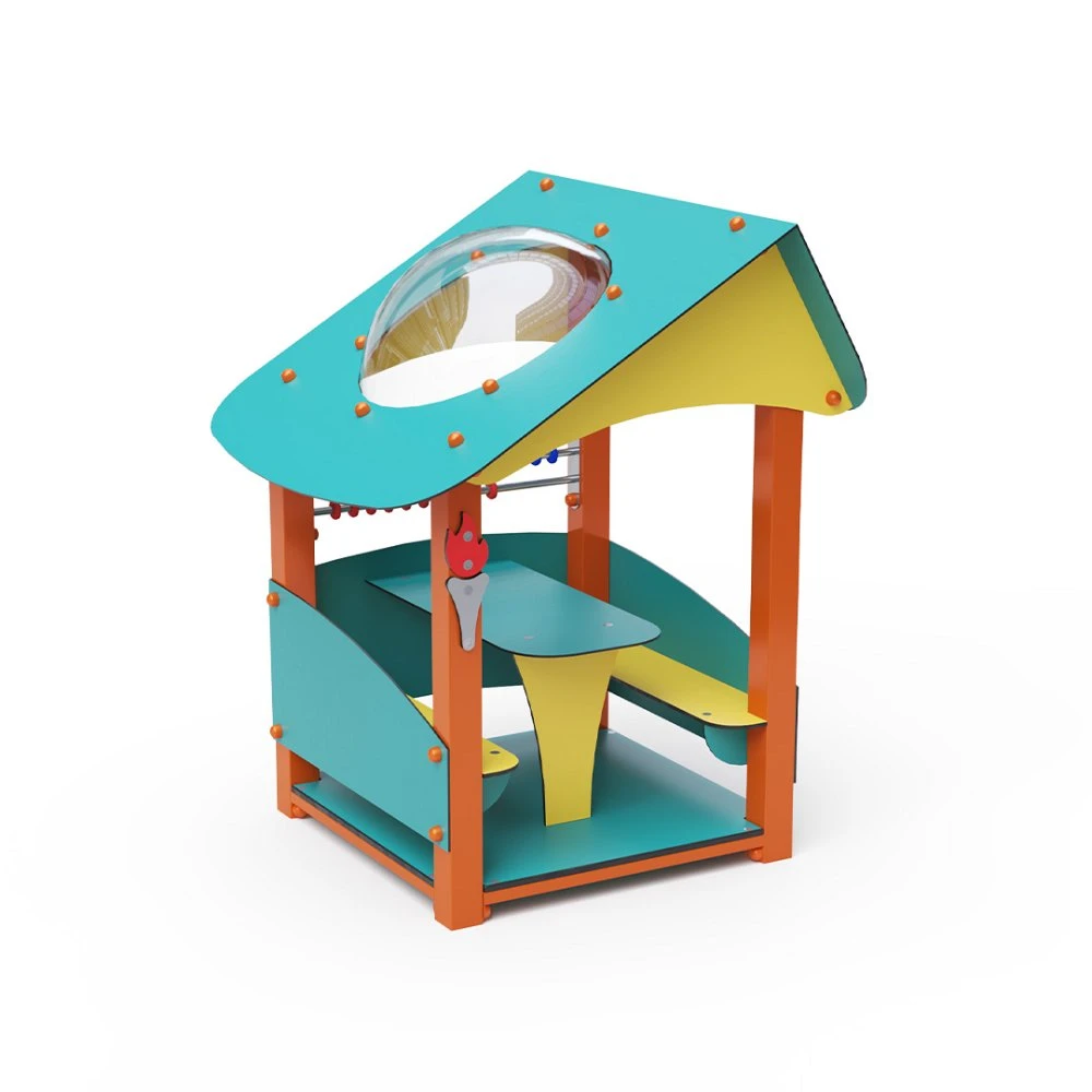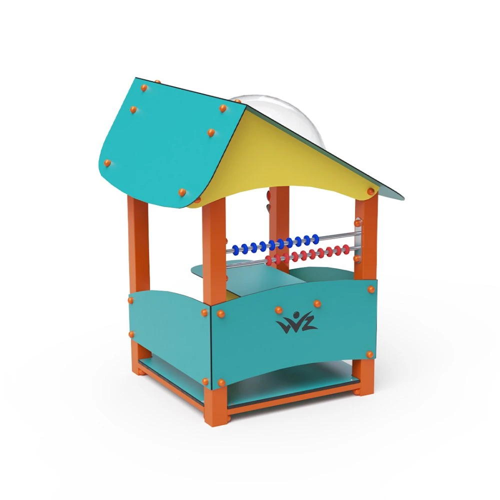 Kućica s kosim krovom, upotpunjena malom abakusom, idealan je set za igralište u vrtićima. Konstrukcija kućice izrađena je od pocinčanog i praškasto obojenog čelika. Sve ploče izrađene su od HPL materijala s UV zaštitom, koji je postojan u boji, netoksičan i nelomljiv. Svi spojevi su od nehrđajućeg čelika i prekriveni plastičnim kapicama.