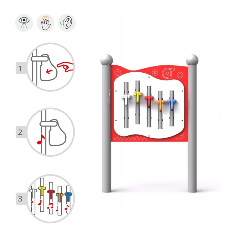 Senzorna ploča za kreativnu igru sa zvukom koji pojačava kreativnost i osjetilno iskustvo djece, uključujući i one u invalidskim kolicima. Pet pentatoničnih cijevnih zvona u CDEGA proizvodi zvuk dobre kvalitete koji će oduševiti i nadahnuti. Zvončići su označeni bojama kako bi djeci olakšali puštanje glazbe prema bojama, dodajući iskustvu dodatnu dimenziju kreativnosti i istraživanja. Struktura ploče izrađena je od crnog čelika premazanog prahom, otpornog na vremenske uvjete i spremnog za intenzivnu upotrebu. Ploča je izrađena od HDPE plastike. Stupovi su završeni kuglastim ukrasnim elementima.