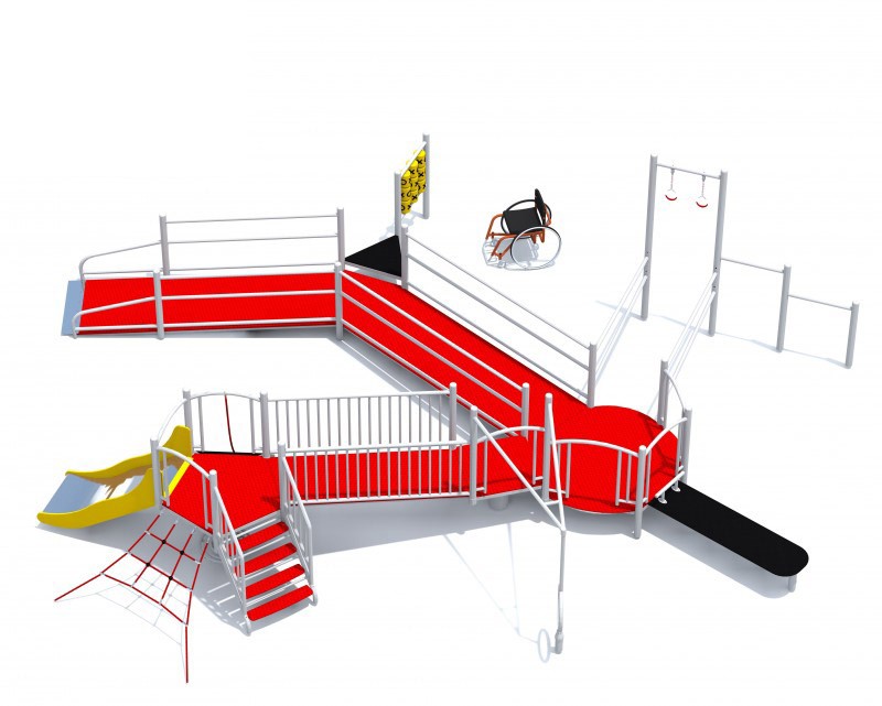Višenamjenski, integrativni set za osobe u invalidskim kolicima i djecu punih sposobnosti. Boja konstrukcije je siva, boja poda je crvena. Konstrukcija je od pocinčanog čelika i bojena prahom, površina tobogana je od nehrđajućeg čelika, stranice tobogana i oba krova od HDPE materijala; pod od PE materijala.