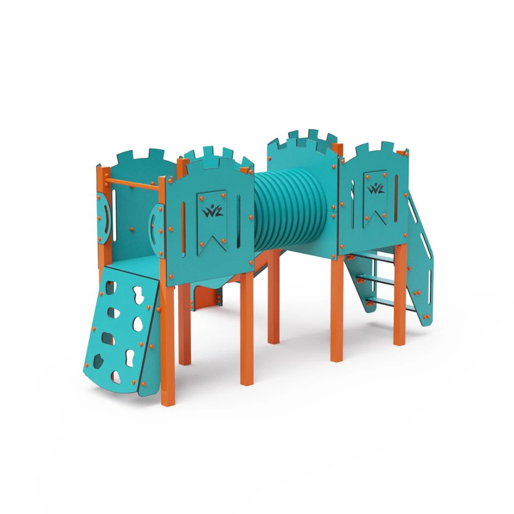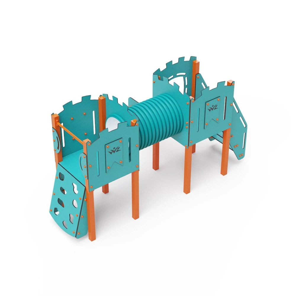 Kombinacija dvostrukog tornja – dva tornja povezana tunelom. Djeca se mogu penjati po setu pomoću stepenica ili zida za penjanje s hvatištima i spuštati se niz tobogan. Tirkizno-narančasti dizajn privlači djecu na igru iz daljine. Čelična konstrukcija otporna je na vremenske uvjete zbog vrućeg pocinčavanja i premazivanja izdržljivom praškastom bojom. Korišteni HPL materijal je kemijski otporan, UV otporan – postojane boje, netoksičan, reciklirajući i nelomljiv. To sprječava ozljede djece od oštrih rubova ili fragmenata. Svi spojevi su od nehrđajućeg čelika i prekriveni plastičnim kapicama radi veće izdržljivosti i sigurnosti.