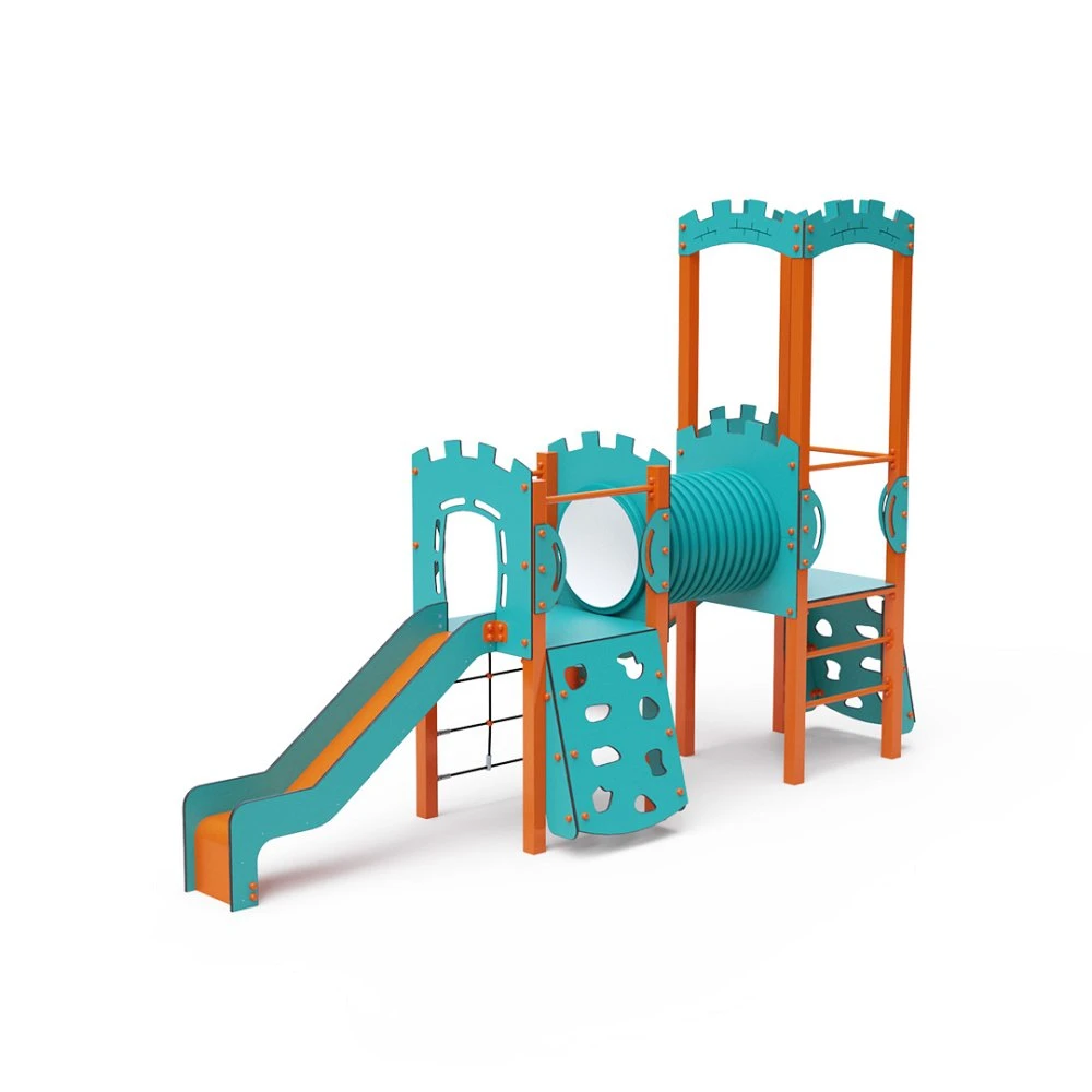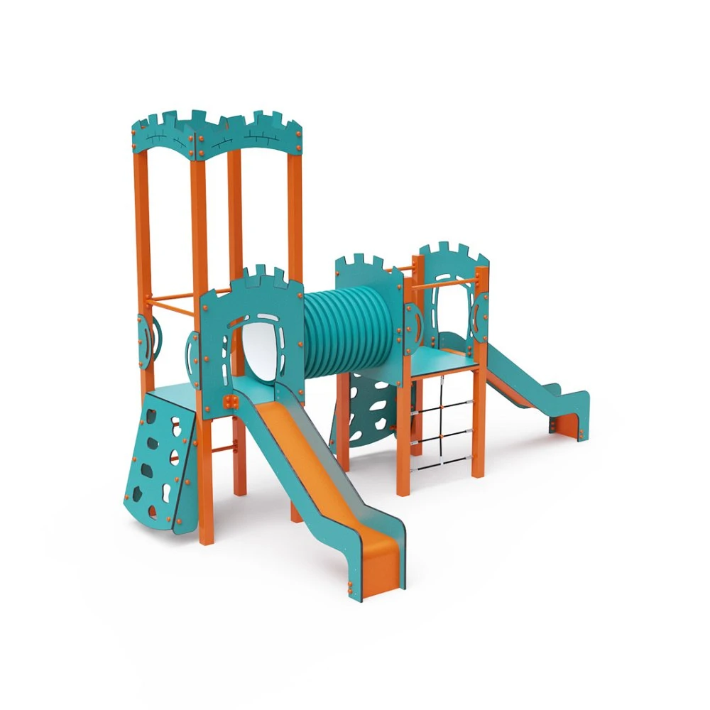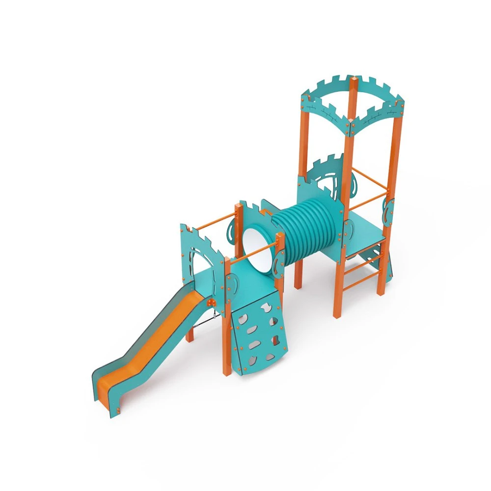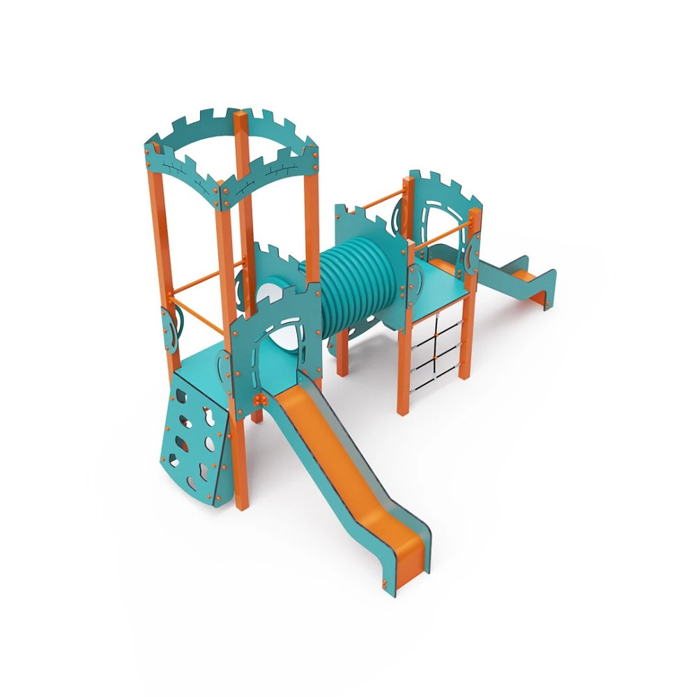 Kombinacija dvostrukog tornja – dva tornja povezana tunelom. Djeca se mogu penjati po setu koristeći jednu od dvije stijene za penjanje s hvataljkama, mrežu od užeta ili ljestve te se spuštati niz jedan od dva tobogana. Tirkizno-narančasti dizajn privlači djecu na igru iz daljine. Čelična konstrukcija otporna je na vremenske uvjete zbog vrućeg pocinčavanja i premazivanja izdržljivom praškastom bojom. Korišteni HPL materijal je kemijski otporan, UV otporan – postojan u boji, netoksičan, reciklirajući i nelomljiv. To sprječava ozljede djece od oštrih rubova ili fragmenata. Užad su izrađena od poliesterskih vlakana omotanih oko središnje jezgre. Ova konstrukcija užeta povećava njegovu čvrstoću i otpornost na mehanička naprezanja. Sam poliester otporan je na mikroorganizme, vremenske uvjete, brzo se suši nakon kiše, postojane je boje i ima visoku čvrstoću. Svi spojevi su od nehrđajućeg čelika i prekriveni plastičnim kapicama radi povećanja trajnosti i sigurnosti.
