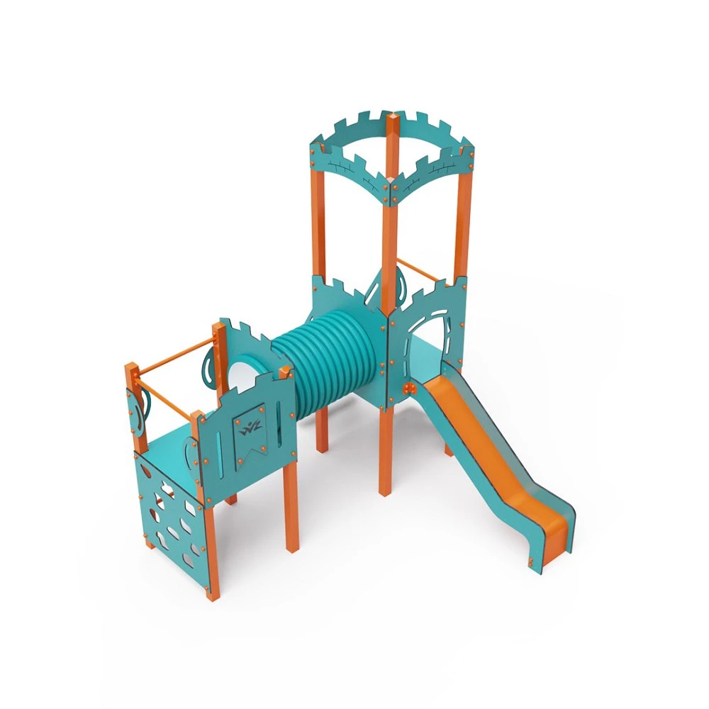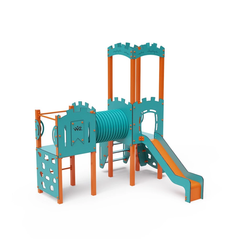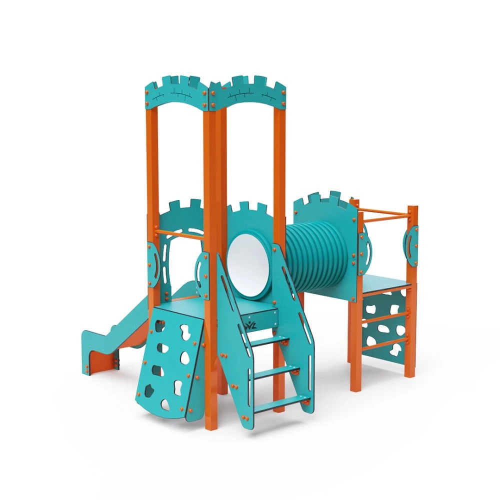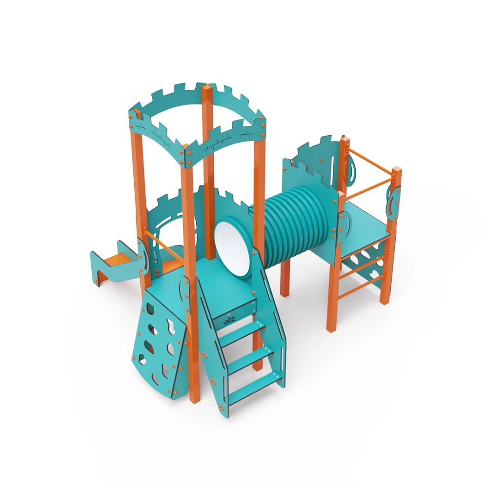 Kombinacija dvostrukog tornja – jedan toranj s grudobranama i drugi niski toranj povezani tunelom. Djeca se mogu penjati po setu koristeći vertikalnu ili kosu stijenu za penjanje s rukohvatima, stepenicama ili ljestvama te se spuštati niz tobogan. Tirkizno-narančasti dizajn privlači djecu na igru ​​iz daljine. Čelična konstrukcija otporna je na vremenske uvjete zahvaljujući vrućem pocinčavanju i premazu izdržljivom praškastom bojom. Korišteni HPL materijal je kemijski otporan, UV otporan – postojane boje, netoksičan, reciklirajući i nelomljiv. To sprječava ozljede od oštrih rubova ili fragmenata. Svi spojevi su od nehrđajućeg čelika i prekriveni plastičnim kapicama radi povećanja trajnosti i sigurnosti.