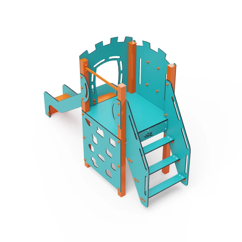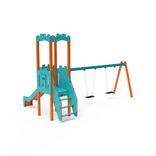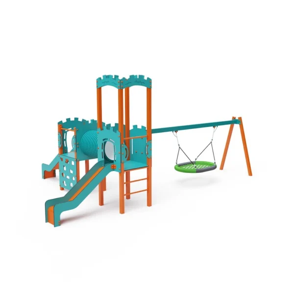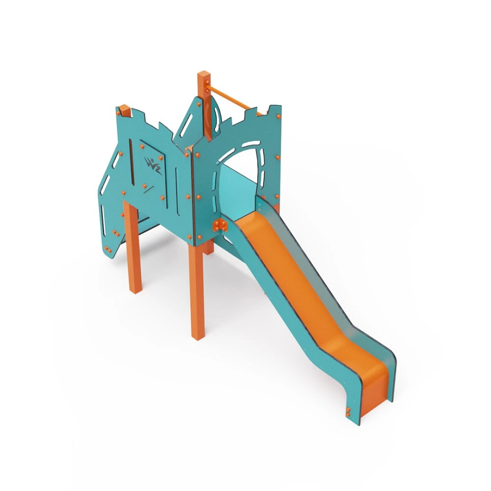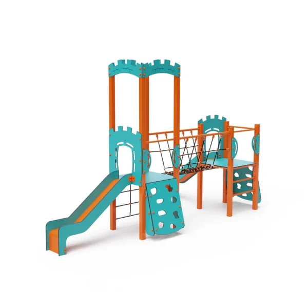 Set s jednim tornjem gdje se djeca mogu penjati stepenicama ili zidom za penjanje i spuštati niz tobogan. Tirkizno-narančasti dizajn privlači već izdaleka. Čelična konstrukcija otporna je na vremenske uvjete zahvaljujući vrućem pocinčavanju i izdržljivom praškastom premazu. Korišteni HPL materijal je kemijski otporan, UV otporan – postojane boje, netoksičan, reciklirajući i nelomljiv, što osigurava da nema rizika od ozljeda djece oštrim rubovima ili krhotinama. Svi spojevi su od nehrđajućeg čelika i prekriveni plastičnim kapicama za povećanu izdržljivost i sigurnost.