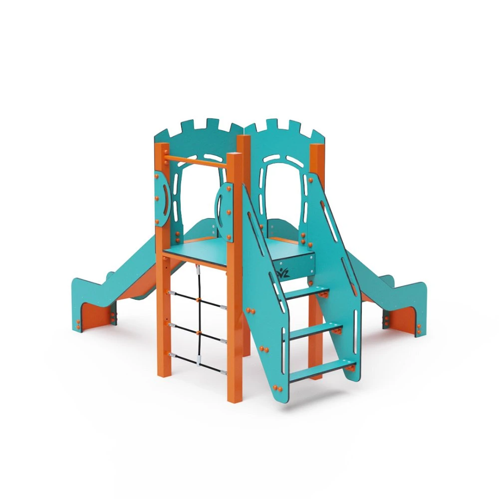 Kombinirani set s jednim tornjem – toranj na koji se djeca mogu penjati pomoću stepenica ili zida za penjanje od užeta i spuštati se niz jedan od dva tobogana. Tirkizno-narančasti dizajn privlači djecu na igru iz daljine. Čelična konstrukcija otporna je na vremenske uvjete zahvaljujući vrućem pocinčavanju i premazu izdržljivom praškastom bojom. Korišteni HPL materijal je kemijski otporan, UV otporan – postojan u boji, netoksičan, reciklirajući i neslomljiv. To sprječava ozljede djece od oštrih rubova ili fragmenata. Užad su izrađena od poliesterskih vlakana namotanih oko središnjeg ojačanja. Ova konstrukcija užeta povećava njegovu čvrstoću i otpornost na mehanička naprezanja. Sam poliester otporan je na mikroorganizme i vremenske uvjete, brzo se suši nakon kiše, postojane je boje i ima visoku čvrstoću. Svi spojevi su od nehrđajućeg čelika i prekriveni plastičnim kapicama radi povećanja trajnosti i sigurnosti.