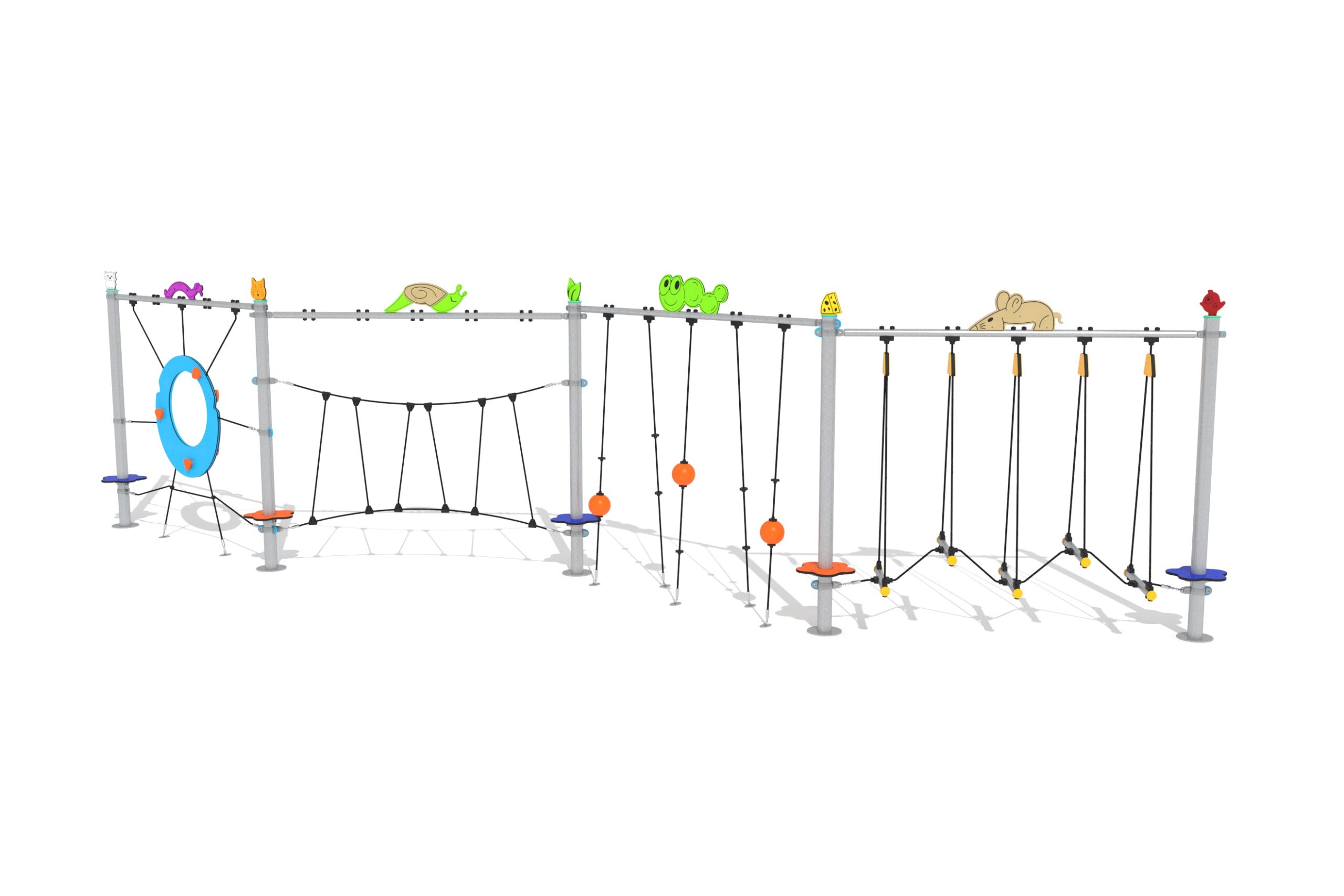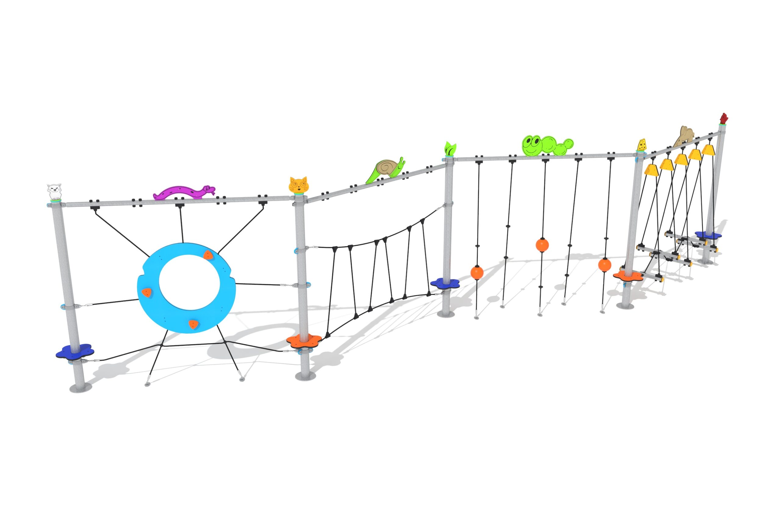 Cik-cak staza s užadima s 4 modula nudi izbor izazova s užadima osmišljenih za poticanje fizičke spretnosti i motoričkog razvoja kod djece. Uključuje vertikalnu mrežu, uski most od užadi, dio vertikalnih užadi i stepenasti most, a sve je tematski osmišljeno kako bi pružilo razigrano i uzbudljivo iskustvo uz osiguranje sigurnosti mališana.