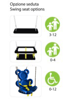 Konstrukcija izrađena od jedne gornje cjevaste grede u obojenom pocinčanom čeliku Ø 89 mm spojene odgovarajućim limenim spojevima 30/10 na 4 stupa od aluminijske legure EN AW 6060 presjeka 90×90 mm; 2 slojevita bilaminatna HPL dekorativna ploča postavljena je na oba kraja grede. Oscilacijski mehanizam omogućen je kroz robusne spojeve od nehrđajućeg čelika opremljene vrhunskim valjkastim ležajevima. Br. 2 ravna sjedala ili sjedala s kolijevkom, izrađena od gume otporne na udarce s aluminijskom jezgrom i vruće pocinčanim lančićima male mreže. Alternativno se mogu ugraditi dvije polietilenske sjedalice za djecu s invaliditetom. Montažni sustav s vijcima od pocinčanog čelika 8,8 i samosigurnim maticama. Obojene najlonske matice s kapicom prema zakonu. Polietilenske zaštitne kape. Premazivanje poliesterskim prahom na 180°C. s vrlo visokom otpornošću na atmosferske utjecaje i UV zrake. Vruće pocinčani čelični nosači za sustav sidrenja u tlu.