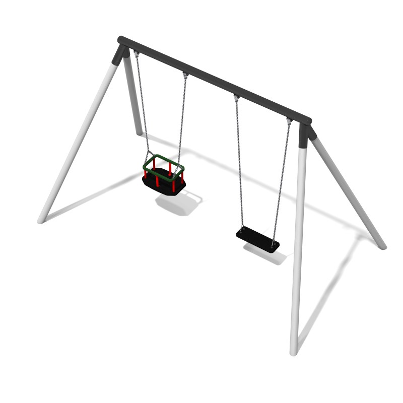 Dvostruka ljuljačka s sigurnosnim baby box sjedalom i ravnim sjedalom namijenjena za bebu i 1 osobu. Boja konstrukcije je siva i grafit, boja sjedala je crna, zelena i crvena.