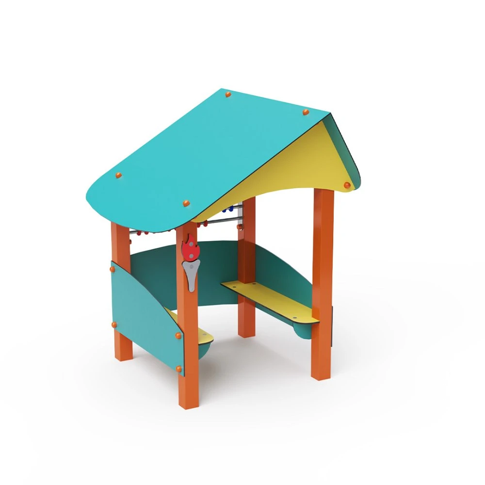 Kućica s kosim krovom, upotpunjena malom abakusom, idealan je set za igralište u vrtićima. Konstrukcija kućice izrađena je od pocinčanog i praškasto obojenog čelika. Sve ploče izrađene su od HPL materijala s UV zaštitom, koji je postojan u boji, netoksičan i nelomljiv. Svi spojevi su od nehrđajućeg čelika i prekriveni plastičnim kapicama.