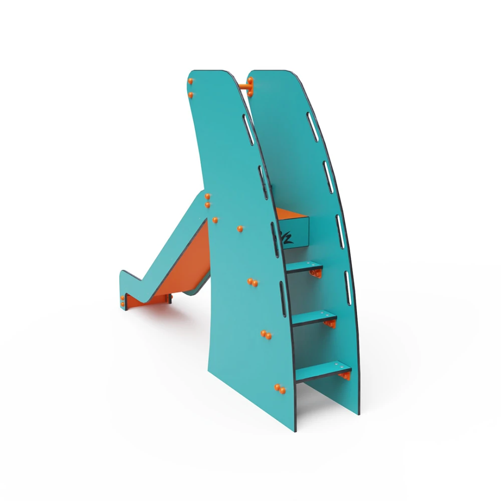 Certificirani tobogan s niskim održavanjem i stepenicama, pogodan za najmanju djecu. Osnovna postavka koja se uklapa čak i u male prostore, pružajući potpuni element za igru. Tirkizno-narančasti dizajn privlači igru iz daljine. Korišteni HPL materijal, HDPE plastika, kemijski je otporna, UV otporna – postojana boja, netoksična, reciklirajuća i nelomljiva. Stoga ne postoji rizik od ozljeda djece oštrim rubovima ili krhotinama. Svi spojevi su od nehrđajućeg čelika i prekriveni plastičnim kapicama radi veće trajnosti i sigurnosti.