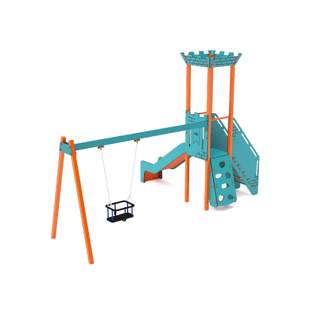Kombinirani mini set za igru ​​s jednim tornjem – toranj s grudobranama po kojima se djeca mogu penjati stepenicama i spuštati niz tobogan. Tirkizno-narančasti dizajn poziva na igru ​​čak i iz daljine. Čelična konstrukcija otporna je na vremenske uvjete zahvaljujući vrućem pocinčavanju i izdržljivom praškastom premazu. Korišteni HPL materijal kemijski je otporan, UV stabilan – postojane boje, netoksičan, reciklirajući i nelomljiv. To eliminira rizik od ozljeda oštrim rubovima ili krhotinama. Svi spojevi izrađeni su od nehrđajućeg čelika i prekriveni plastičnim kapicama radi veće izdržljivosti i sigurnosti.