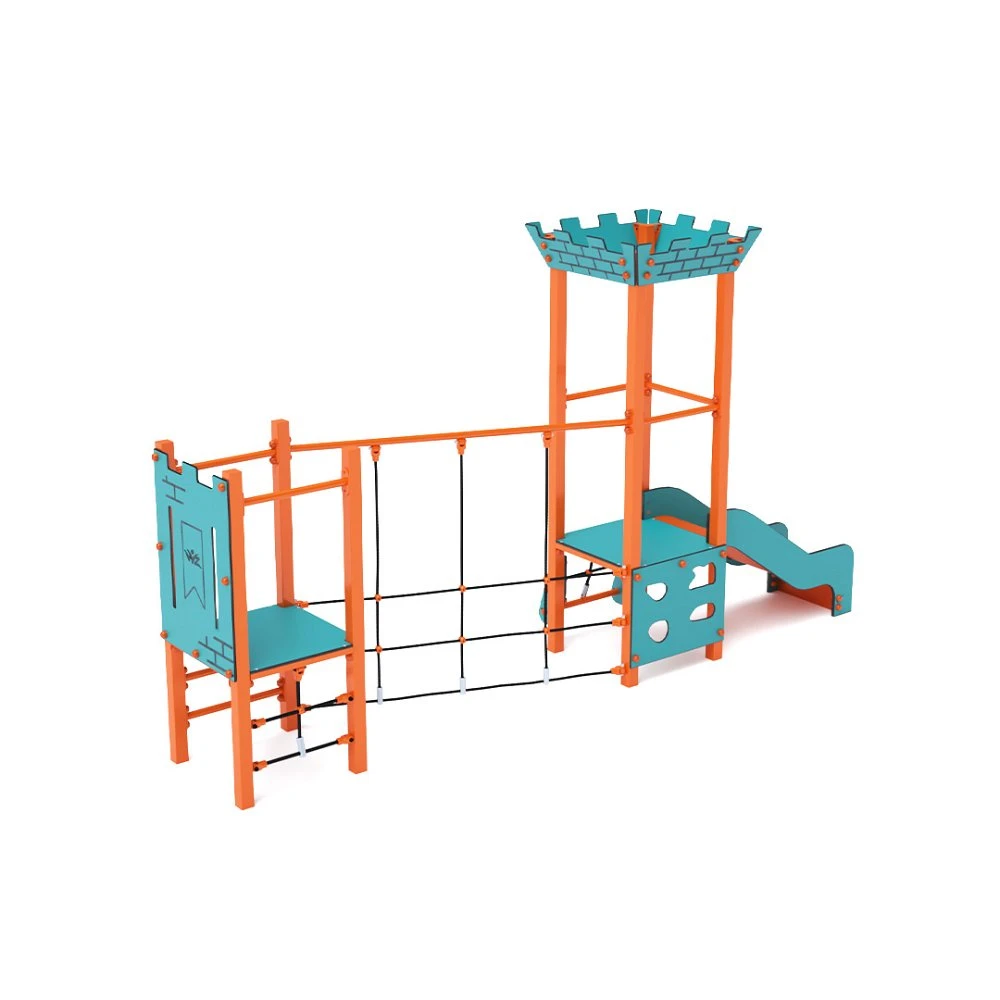 Kombinirani mini set za igru s dva tornja. Tornjevi su povezani mostom od greda. Djeca mogu pristupiti setu za igru preko dvije kose stijene za penjanje i dvije vertikalne ljestve za penjanje, a spuštaju se pomoću dva tobogana. Upečatljiv tirkizno-narančasti dizajn poziva djecu na igru izdaleka. Čelična konstrukcija otporna je na vremenske uvjete zahvaljujući vrućem pocinčavanju i izdržljivom praškastom premazu. HPL ploče su kemijski otporne, UV-stabilne – postojane boje, netoksične, reciklirajuće i nelomljive, što eliminira rizik od ozljeda od oštrih rubova ili iverja. Svi spojevi izrađeni su od nehrđajućeg čelika i prekriveni plastičnim kapicama radi veće trajnosti i sigurnosti.