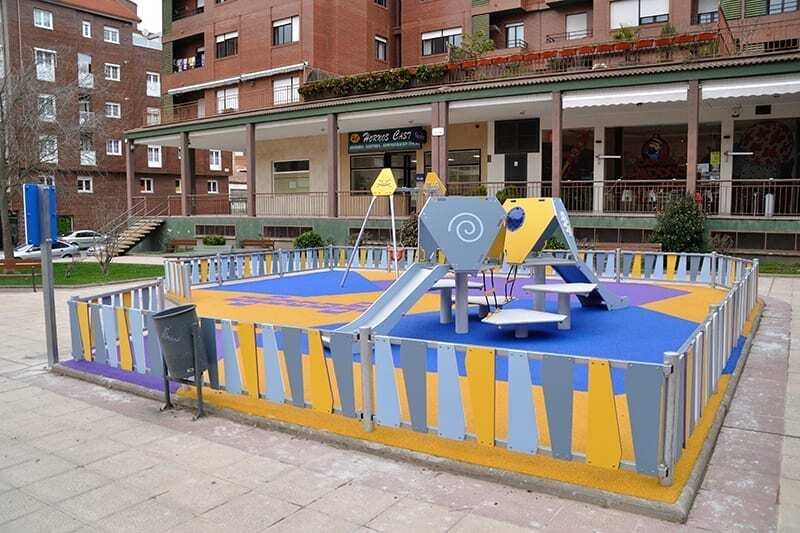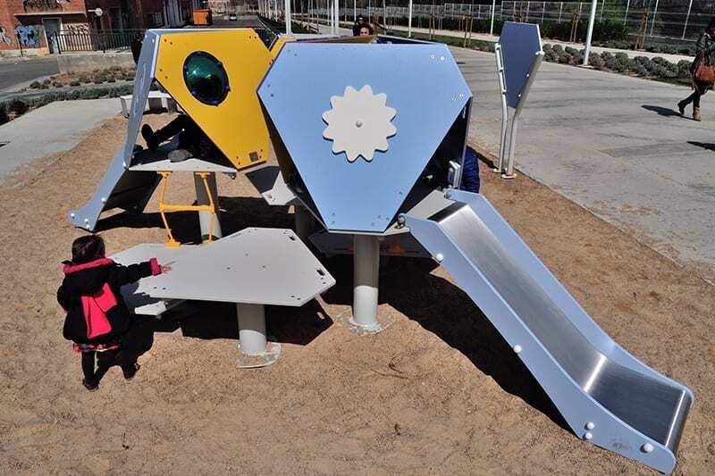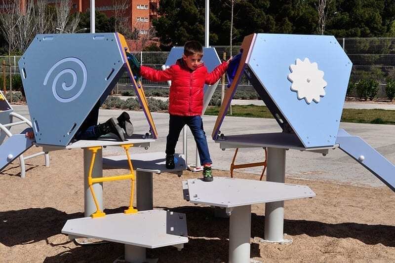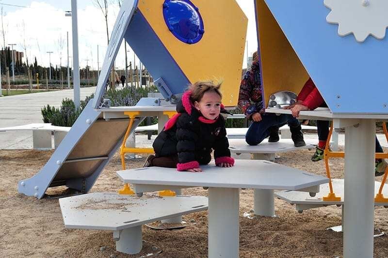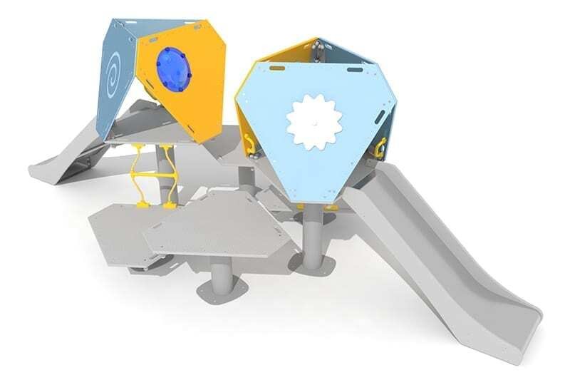Uključuje 6 platformi na različitim visinama, prozore, ljestve od užadi, rotirajuće kotače, geometrijske uzorke i 2 tobogana.