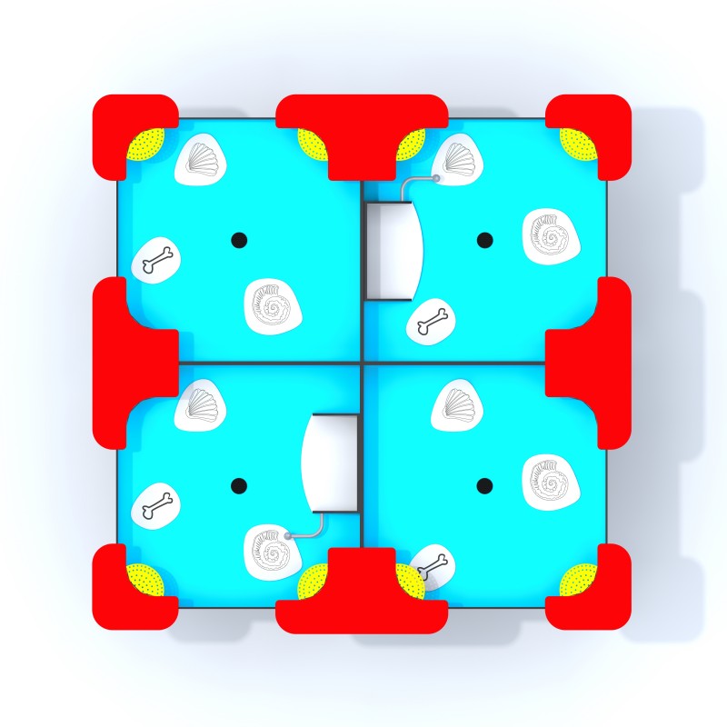 Četverostruki senzorni pješčanik dizajniran za kreativnu igru s pijeskom i vodom, prilagođen za korištenje djeci u invalidskim kolicima. Četverostruki pješčanik kvadratnog oblika opremljen je korisnim vrhovima za izradu kolača od pijeska i sita te ručkom za sipanje pijeska. Na dnu pješčanika nalaze se atraktivni elementi koji imitiraju fosile, poput školjki ili kostiju. Otvori za vodu postavljeni u sredini pješčanika olakšavaju čišćenje uređaja nakon igranja. Konstrukcija je izrađena od plastificiranog pocinčanog čelika, otpornog na vremenske uvjete i intenzivnu upotrebu. Bočne stijenke i dodatni ukrasni elementi izrađeni su od HDPE ploče. Ručka za sipanje pijeska izrađena je od nehrđajućeg čelika.