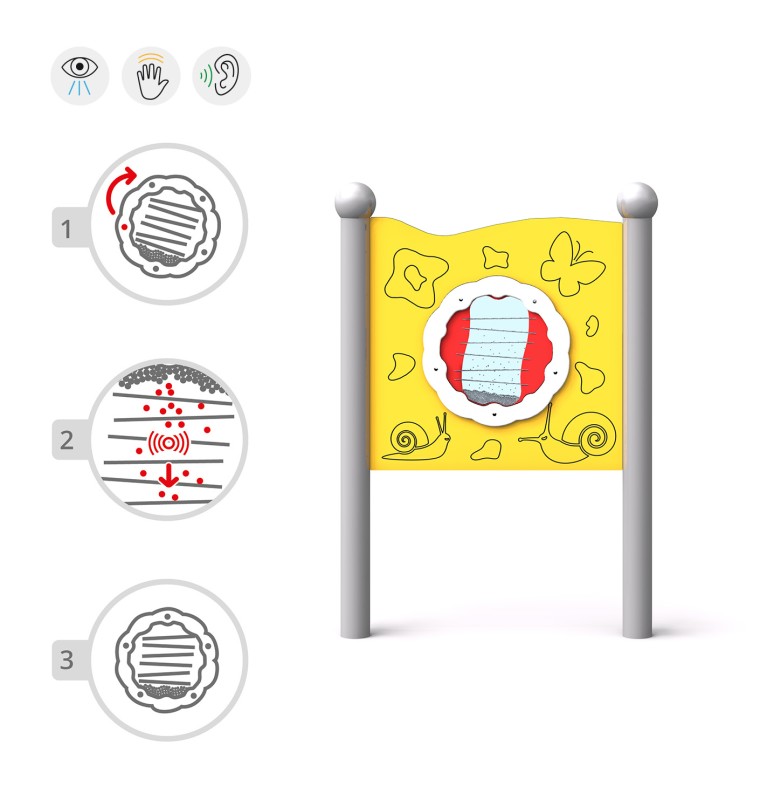 Senzorna ploča za kreativnu igru sa zvukom koji pojačava kreativnost i osjetilno iskustvo djece, uključujući i one u invalidskim kolicima. Uređaj ima jedinstven dizajn koji proizvodi zvuk kiše kada se okrene. Ovaj uređaj savršen je za opuštanje, senzorno istraživanje i maštovitu igru. Struktura ploče izrađena je od crnog čelika premazanog prahom, otpornog na vremenske uvjete i spremnog za intenzivnu upotrebu. Ploča je izrađena od HDPE plastike. Stupovi su završeni kuglastim ukrasnim elementima.