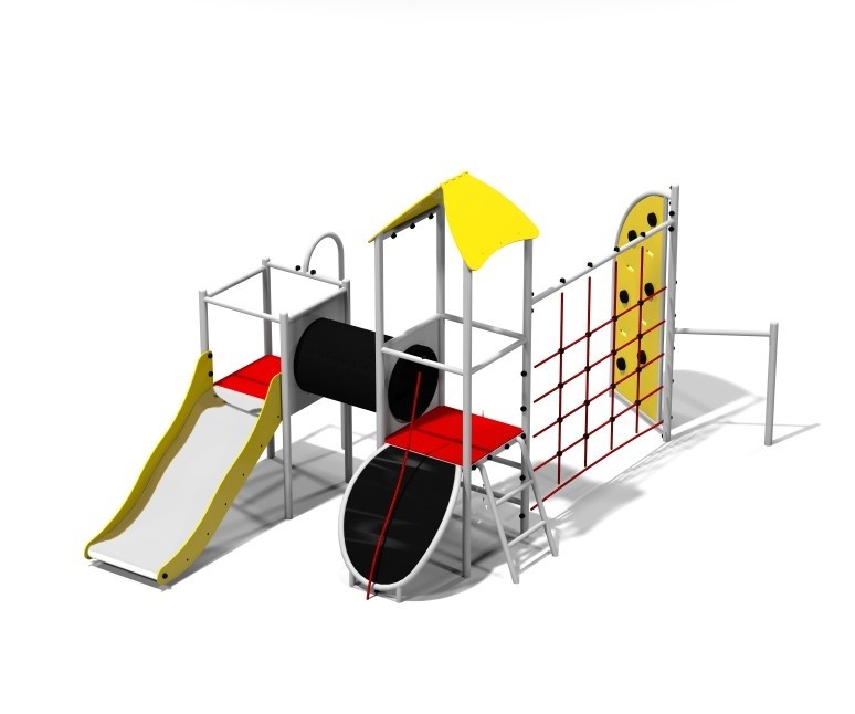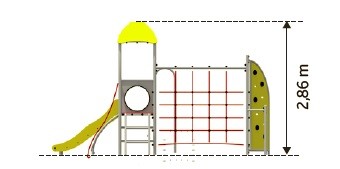Višenamjenski set za penjanje s dva tornja. Konstrukcija seta je pocinčana, praškasto obojena i sastoji se od cijevi zaobljenog profila. Pod platformi prekriven je PE pločom s protukliznim točkicama. Opremljen je polipropilenskim užadima od 16 mm ojačanim čeličnom jezgrom. Površina tobogana izrađena je od nehrđajućeg čelika, a stranice tobogana izrađene su od HDPE materijala. Opcionalno se može pričvrstiti plastični tobogan.