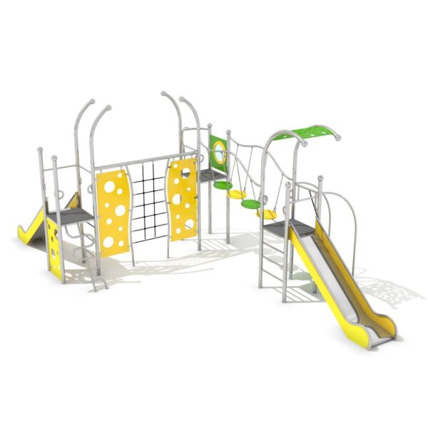Višenamjenski set za penjanje s pet tornjeva. Konstrukcija seta je pocinčana, praškasto obojena i sastoji se od cijevi zaobljenog profila. Pod platforme prekriven je PE pločom s protukliznim točkicama. Opremljen je polipropilenskim užadima od 16 mm ojačanim čeličnom jezgrom. Površina tobogana izrađena je od nehrđajućeg čelika, stranice tobogana izrađene su od HDPE materijala. Plastični tobogan se može dodatno pričvrstiti.
