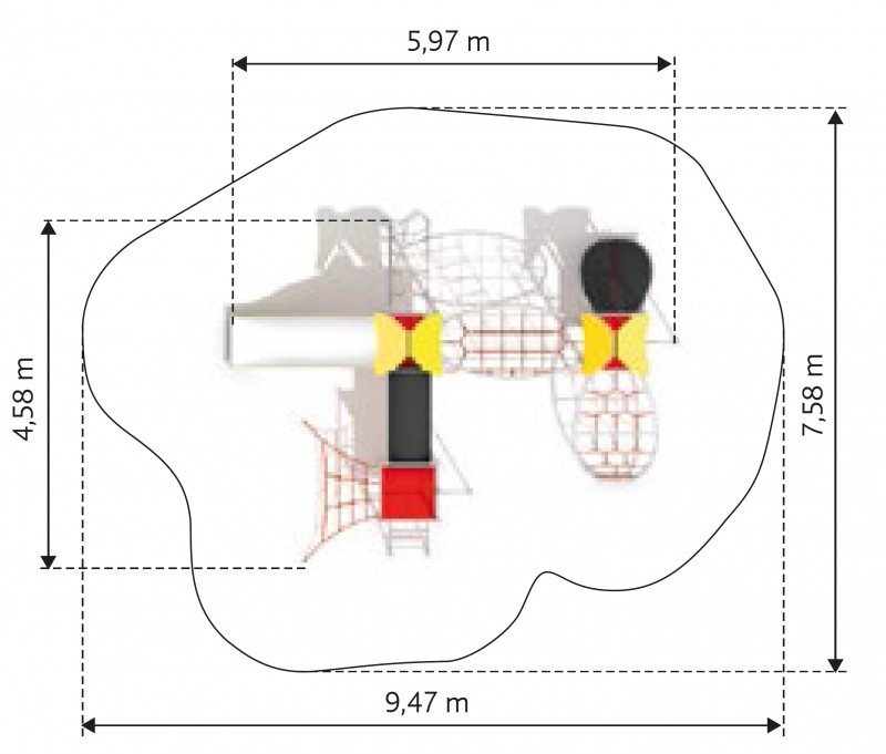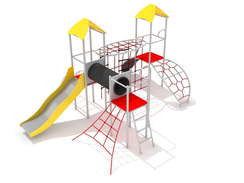 Višenamjenski set za penjanje s dva tornja. Konstrukcija se temelji na pocinčanim i praškasto obojenim cijevima zaobljenog profila. Pod platforme prekriven je PE pločom s protukliznim točkama. Opremljen je polipropilenskim užadima od 16 mm ojačanim čeličnom jezgrom. Površina tobogana izrađena je od nehrđajućeg čelika, stranice tobogana izrađene su od HDPE materijala. Plastični tobogan se može dodatno pričvrstiti. Igralište namijenjeno djeci u dobi od 3 do 15 godina.