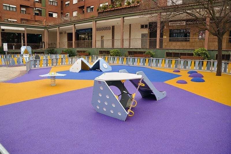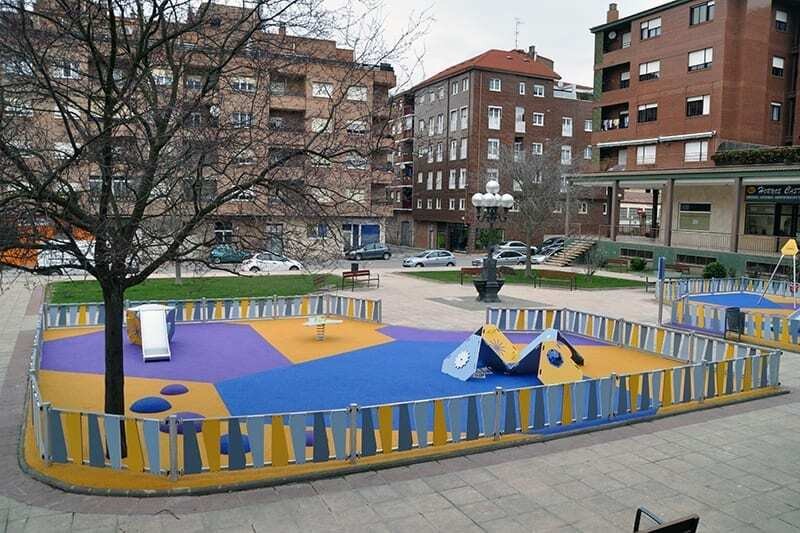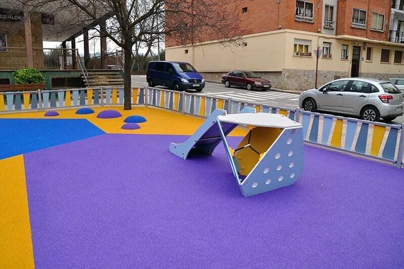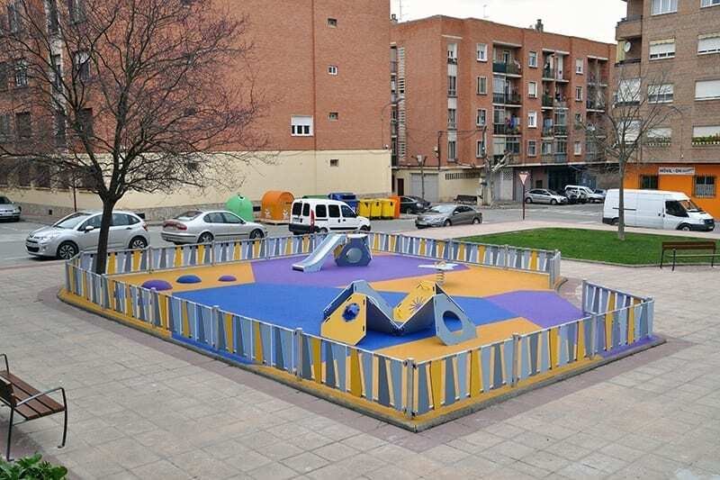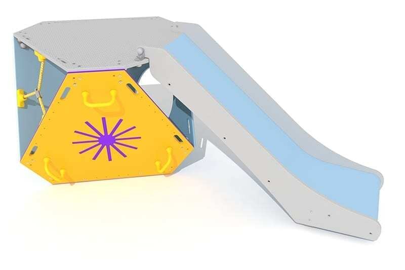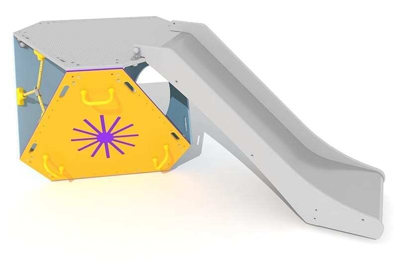 Uključuje platformu, kružni ulaz, geometrijske uzorke i tobogan.