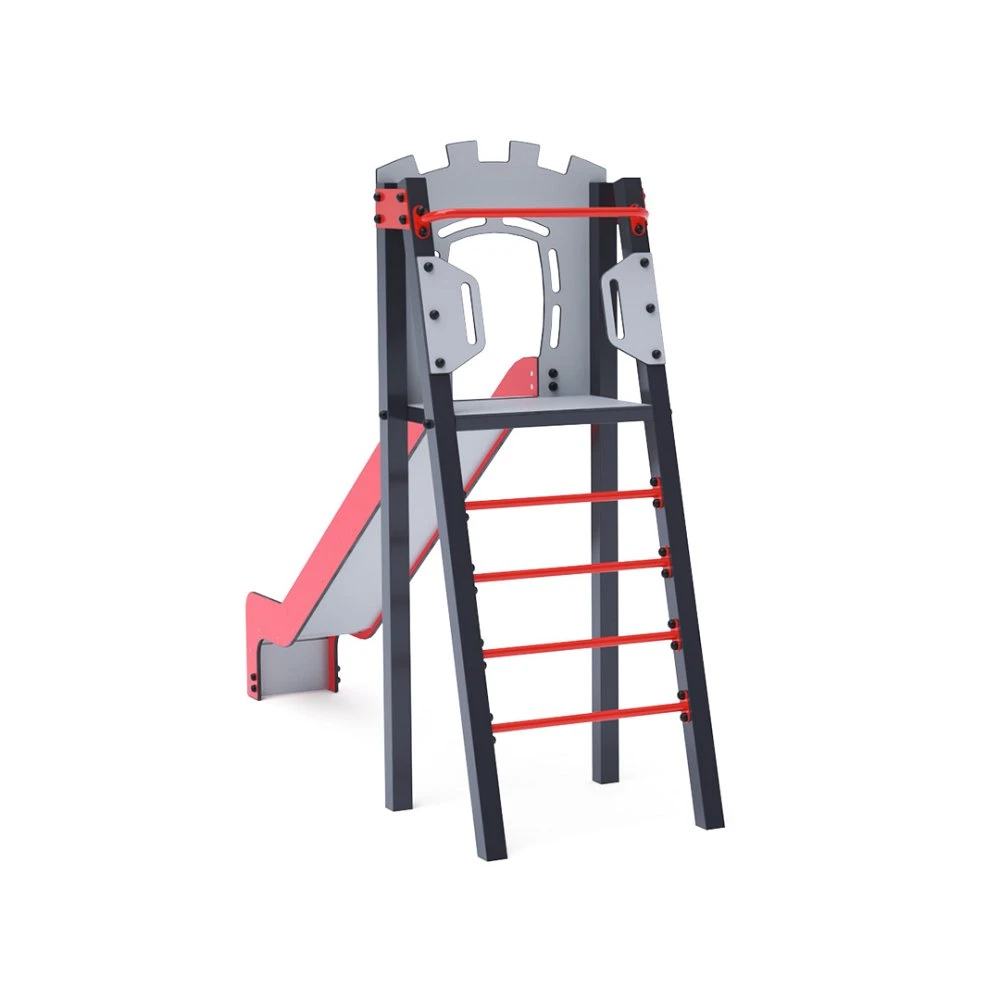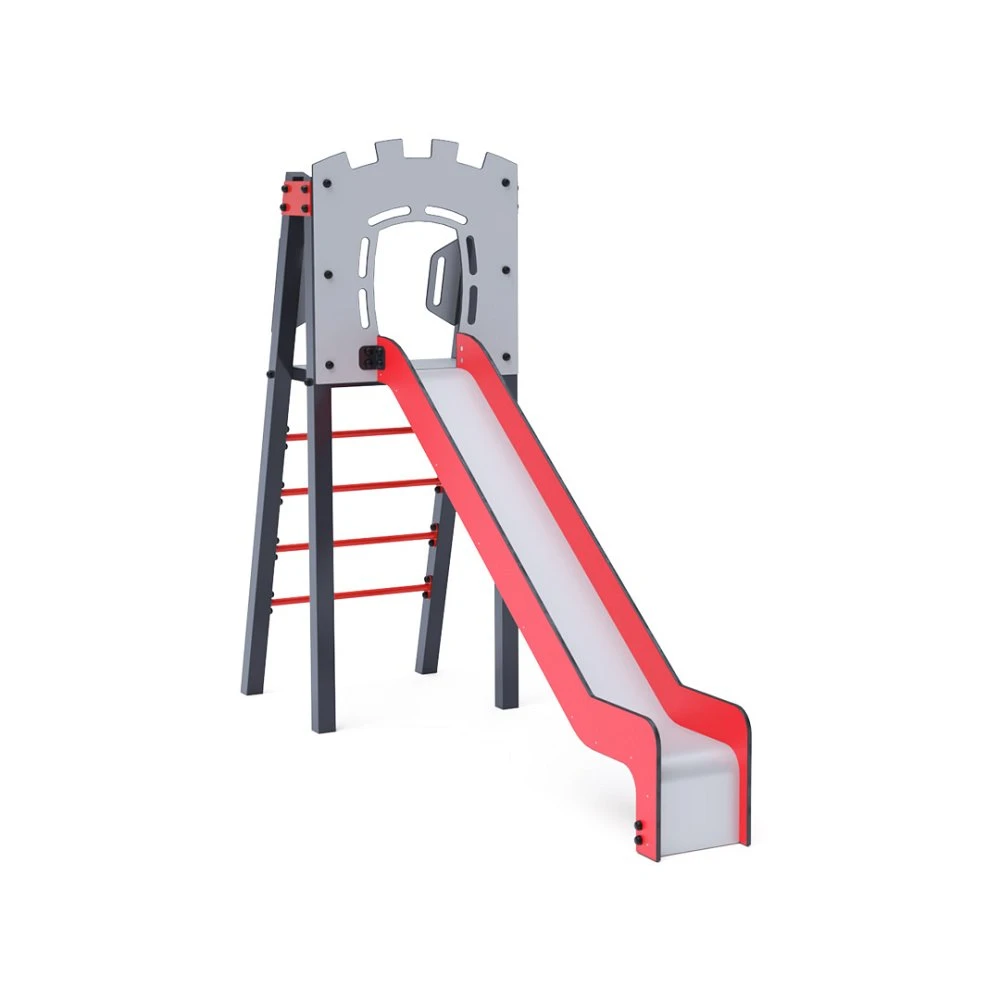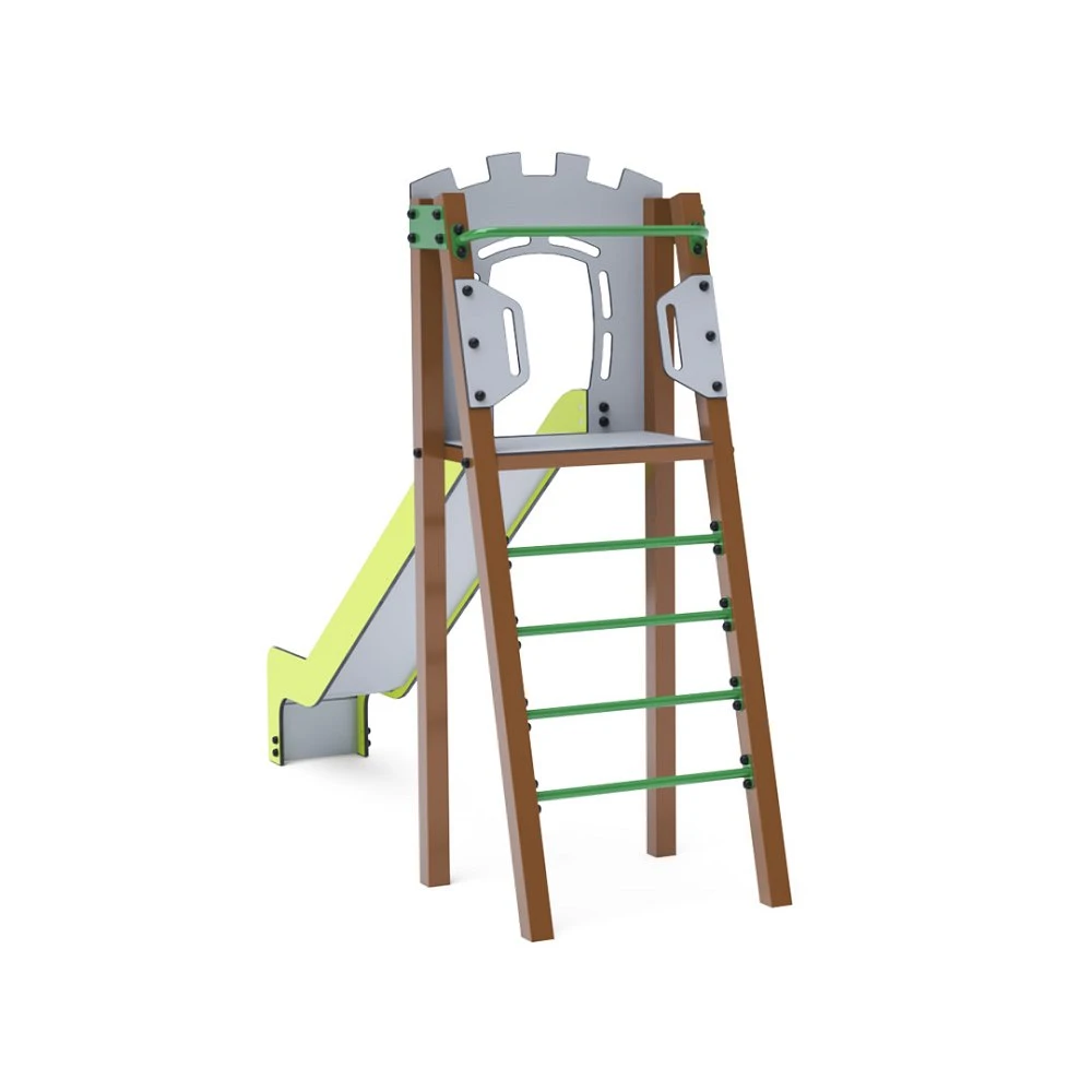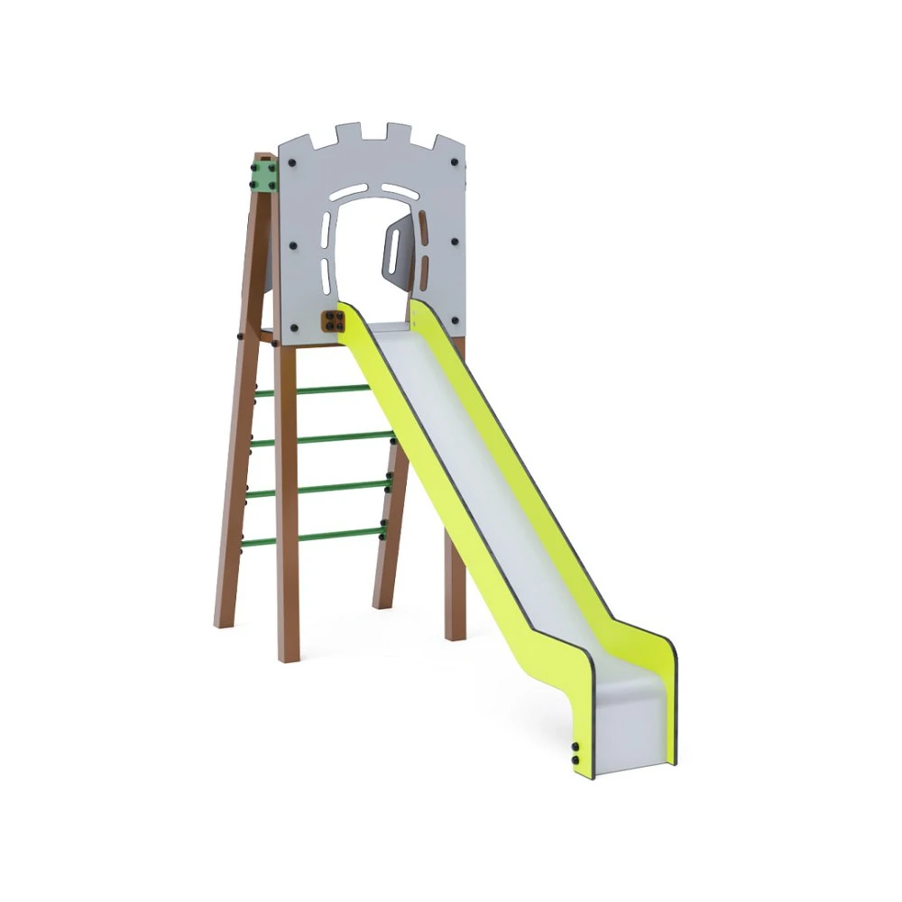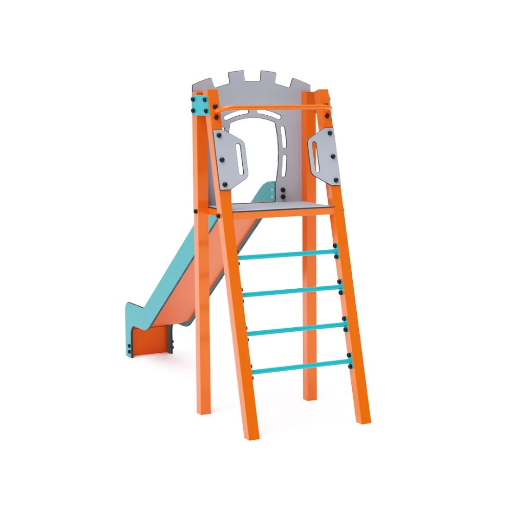 Certificirani toranj u obliku slova A bez održavanja s ljestvama i toboganom. Ova osnovna postava pristaje čak i u male prostore, nudeći potpuni element za igru. Njegov tirkizni i narančasti dizajn primamljuje izdaleka. Čelična konstrukcija otporna je na vremenske uvjete zahvaljujući vrućem pocinčavanju i praškastom premazu. Korištena HDPE plastika (polietilen visoke gustoće) kemijski je otporna, UV stabilna, netoksična, reciklirajuća i nelomljiva, što osigurava da nema oštrih rubova ili fragmenata koji bi mogli ozlijediti djecu. Svi spojevi su od nehrđajućeg čelika i prekriveni plastičnim kapicama radi veće izdržljivosti i sigurnosti.