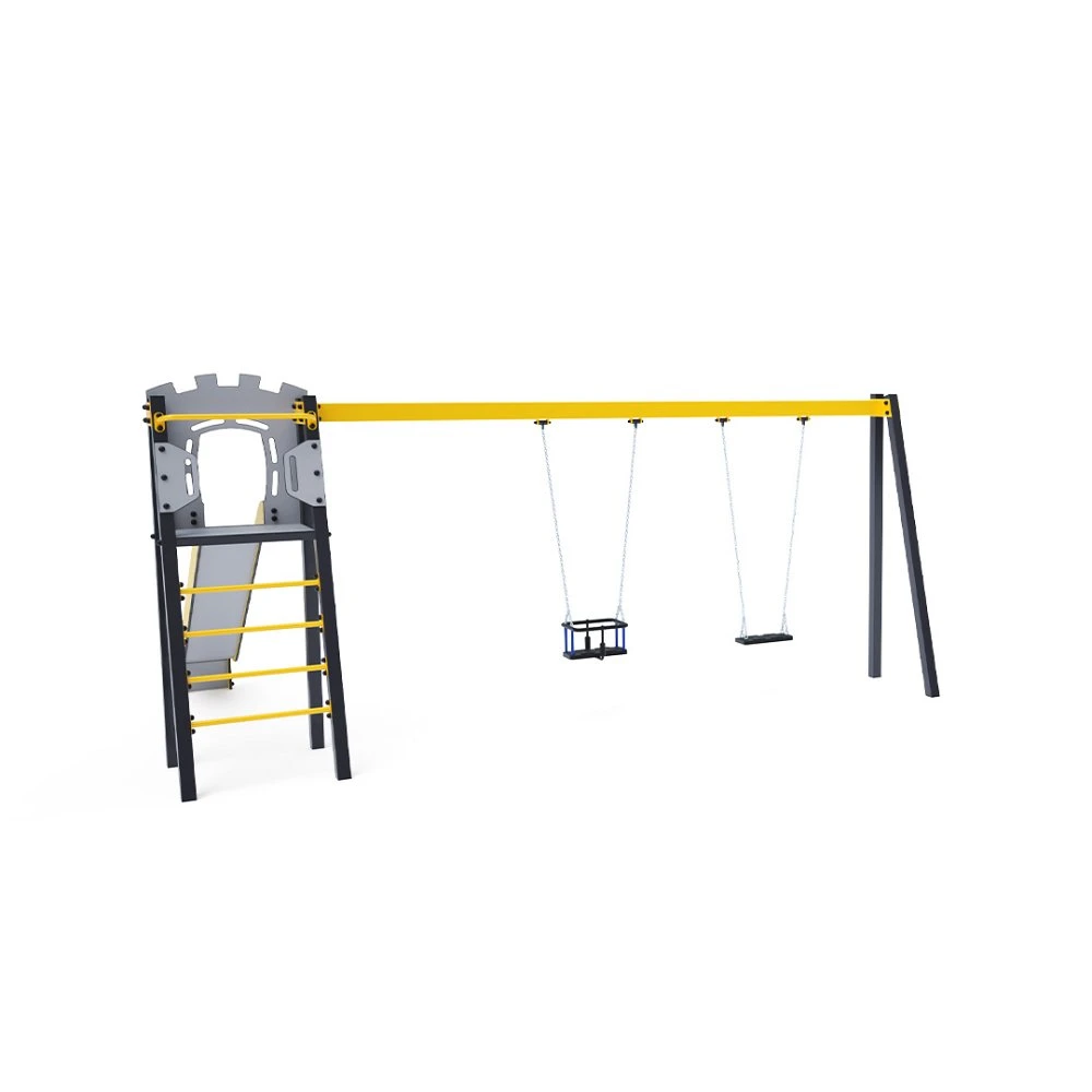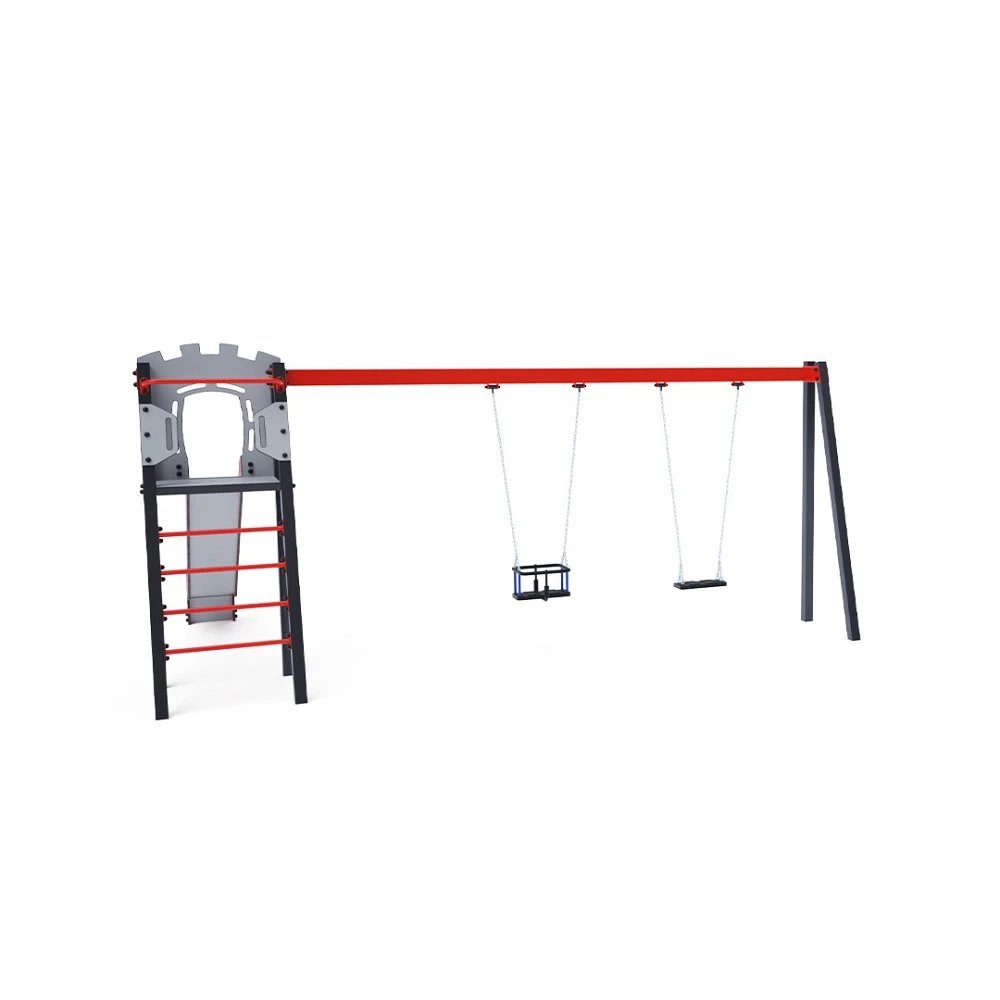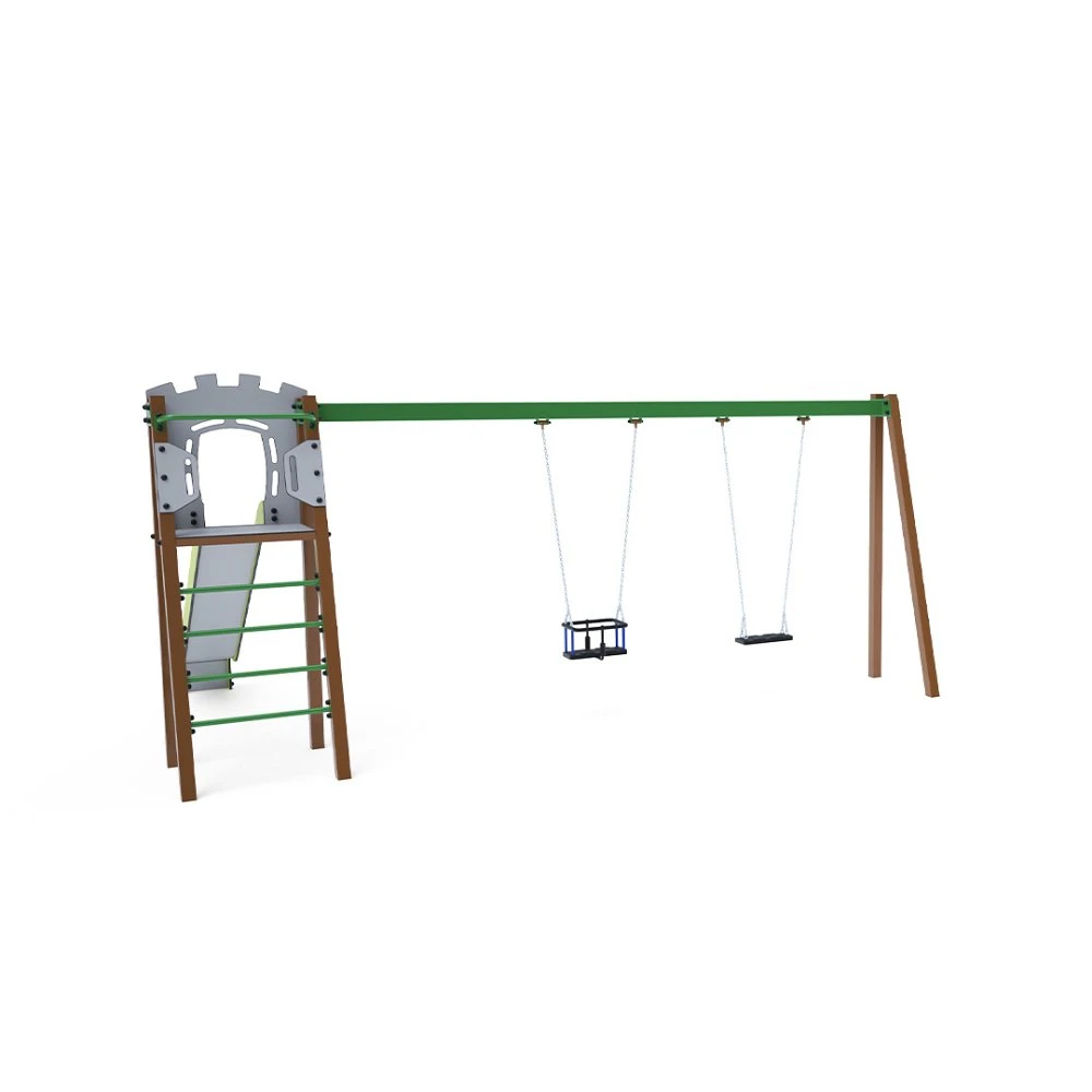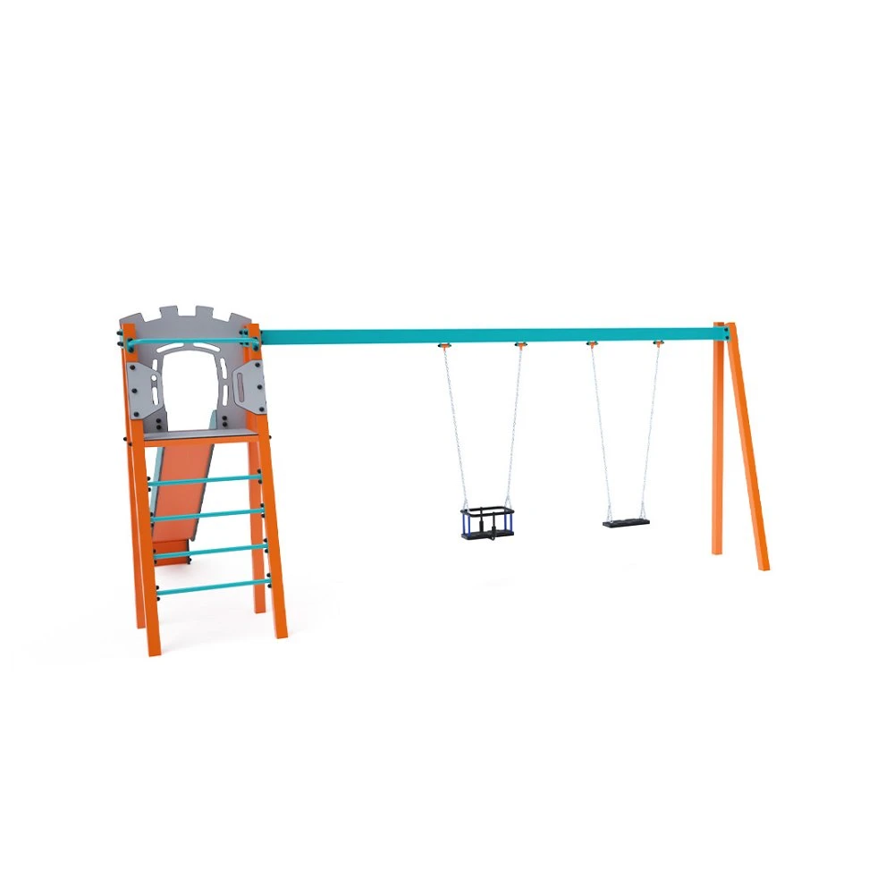 Tobogan Certificirani toranj u obliku slova A koji ne zahtijeva održavanje, s ljestvama i toboganom, dopunjen dvostrukom ljuljačkom s tradicionalnim i dječjim sjedalicama. Dječja sjedalica uključuje pregradu s pregradom između djetetovih nogu, sprječavajući klizanje ili pad tijekom ljuljanja, a istovremeno omogućuje djetetu da se udobno nasloni. Njezin tirkizni i narančasti dizajn privlačan je izdaleka. Čelična konstrukcija otporna je na vremenske uvjete zahvaljujući vrućem pocinčavanju i praškastom premazu. Korišteni HPL materijal i HDPE plastika kemijski su otporni, UV-stabilni, postojane boje, netoksični, reciklabilni i nelomljivi, što osigurava da djeca nemaju rizika od ozljeda oštrim rubovima ili krhotinama. Svi spojevi su od nehrđajućeg čelika i prekriveni plastičnim kapicama radi veće trajnosti i sigurnosti.
