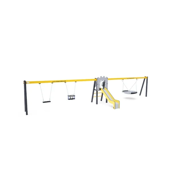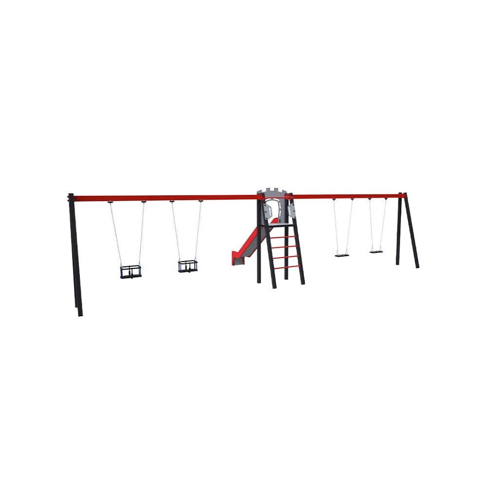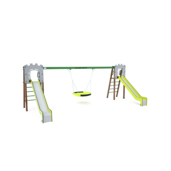 Certificirani toranj u obliku slova A koji ne zahtijeva održavanje, s ljestvama i toboganom, upotpunjen s dvije viseće ljuljačke. S jedne strane nalaze se dva tradicionalna sjedala, a s druge strane dvije dječje sjedalice. Dječja sjedalica uključuje pregradu s pregradom između djetetovih nogu, što sprječava klizanje ili pad tijekom ljuljanja, a istovremeno omogućuje djetetu da se udobno nasloni. Njezin tirkizni i narančasti dizajn privlačan je izdaleka. Čelična konstrukcija otporna je na vremenske uvjete zahvaljujući vrućem pocinčavanju i praškastom premazu. HPL (visokotlačni laminat) materijal i HDPE (polietilen visoke gustoće) plastika koji se koriste kemijski su otporni, UV stabilni, postojane boje, netoksični, reciklabilni i nelomljivi, što osigurava da djeca nemaju rizik od ozljeda oštrim rubovima ili krhotinama. Svi spojevi su od nehrđajućeg čelika i prekriveni plastičnim kapicama radi veće izdržljivosti i sigurnosti.