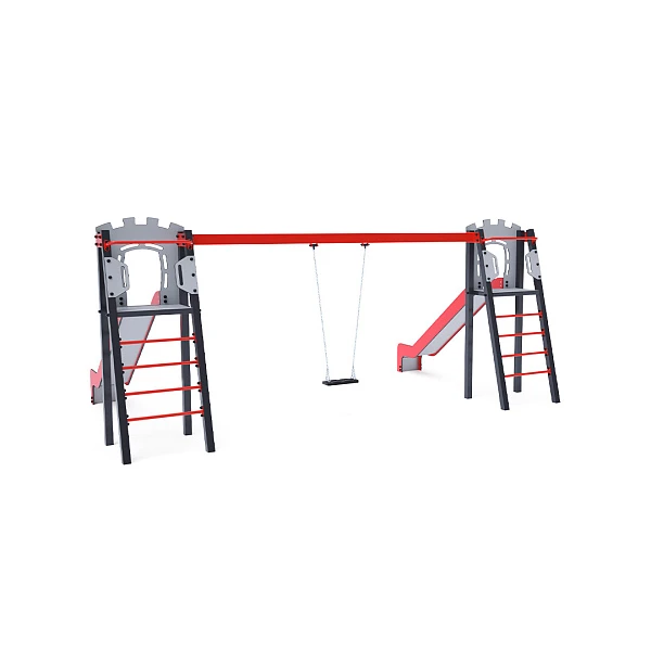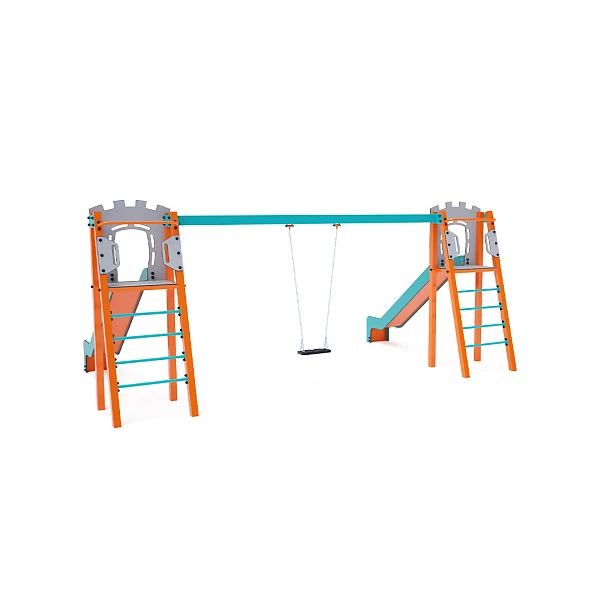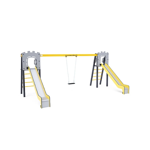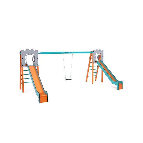 Tobogan Dva certificirana tornja u obliku slova A koja ne zahtijevaju održavanje, s ljestvama i toboganom, nadopunjena visećom ljuljačkom. Možete birati između tradicionalnog sjedala ili dječjeg sjedala. Dječje sjedalo uključuje pregradu s pregradom između djetetovih nogu, što sprječava klizanje ili pad. Također omogućuje djetetu da se udobno nasloni. Čelična konstrukcija otporna je na vremenske uvjete zahvaljujući vrućem pocinčavanju i praškastom premazu. Korišteni HPL materijal i HDPE plastika kemijski su otporni, UV-stabilni, postojane boje, netoksični, reciklabilni i nelomljivi, što osigurava da nema rizika od ozljeda oštrim rubovima ili krhotinama za djecu.