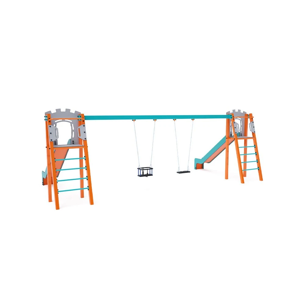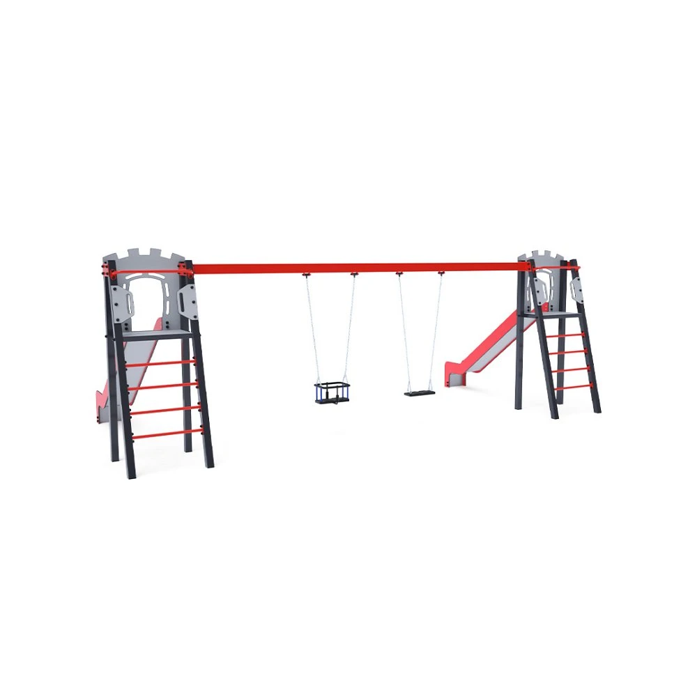 Dva certificirana tornja u obliku slova A koja ne zahtijevaju održavanje, s ljestvama i toboganom, nadopunjena visećom ljuljačkom. Možete odabrati klasičnu ili dječju sjedalicu. Dječja sjedalica za djecu uključuje pregradu s prečkom između djetetovih nogu, što sprječava klizanje ili pad. Istovremeno se dijete može nasloniti. Čelična konstrukcija otporna je na vremenske uvjete zahvaljujući vrućem pocinčavanju i izdržljivom praškastom premazu. Korišteni HPL materijal i HDPE plastika kemijski su otporni, UV otporni – postojani u boji, netoksični, reciklirajući i nelomljivi. Ne postoji rizik od ozljeda djece od oštrih rubova ili fragmenata.
