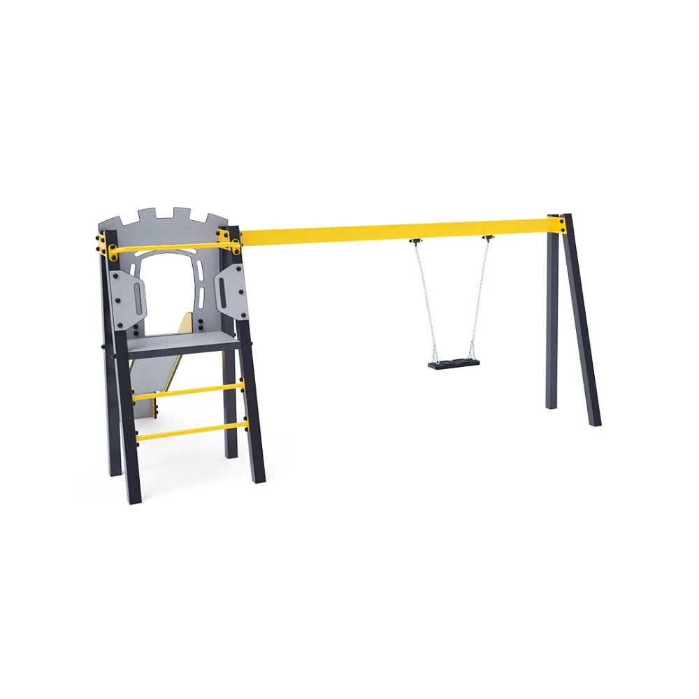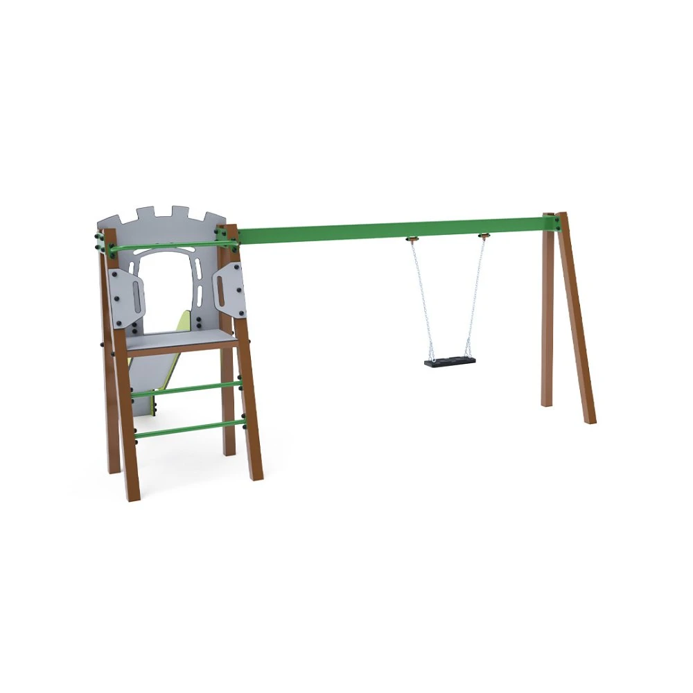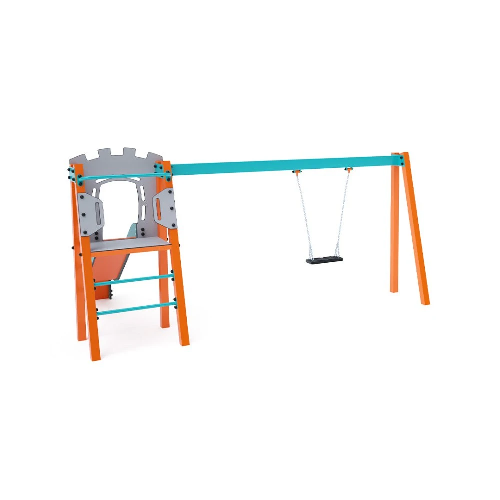 Certificirani toranj u obliku slova A koji ne zahtijeva održavanje, s ljestvama i toboganom, upotpunjen visećom ljuljačkom s tradicionalnim sjedalom. Njegov tirkizni i narančasti dizajn privlači iz daljine. Čelična konstrukcija otporna je na vremenske uvjete zahvaljujući vrućem pocinčavanju i praškastom premazu. Korištena HPL i HDPE plastika kemijski su otporne, UV stabilne, postojane boje, netoksične, reciklabilne i nelomljive, što osigurava da djeca nemaju rizika od ozljeda oštrim rubovima ili krhotinama. Svi spojevi su od nehrđajućeg čelika i prekriveni plastičnim kapicama radi veće izdržljivosti i sigurnosti.