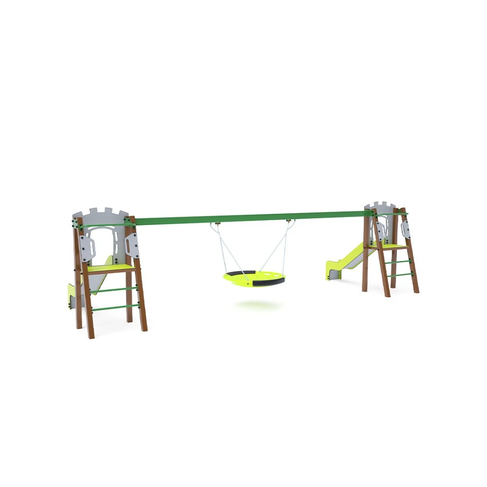Dva certificirana tornja u obliku slova A koja ne zahtijevaju održavanje, s ljestvama i toboganom, nadopunjena ljuljačkom s ljuljačkom u obliku gnezda. Ljuljačka u obliku gnezda prikladna je za ljuljanje male djece dok leže ili za više djece odjednom. Gnijezdo ima sigurnosni ovjes s lancem za zaključavanje. Čelična konstrukcija otporna je na vremenske uvjete zahvaljujući vrućem pocinčavanju i izdržljivom praškastom premazu. Korišteni HPL materijal i HDPE plastika kemijski su otporni, UV otporni – postojani u boji, netoksični, reciklirajući i nelomljivi. To osigurava da ne postoji rizik od ozljeda djece oštrim rubovima ili krhotinama.