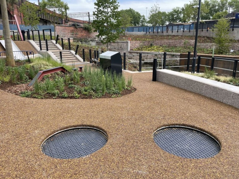 Trampolin vrhunske kvalitete za dugotrajnu upotrebu na otvorenom tijekom cijele godine; može se ostaviti i u mokrim uvjetima.Trampolin je dizajniran za korištenje sa sustavom mokrih površina. Do unutarnjeg ruba trampolin se može prekriti, a kao rezultat vidimo samo podlogu za skakanje na površini igrališta. Trampolin je opremljen pocinčanim oprugama i podlogom za skakanje otpornom na vremenske uvjete.