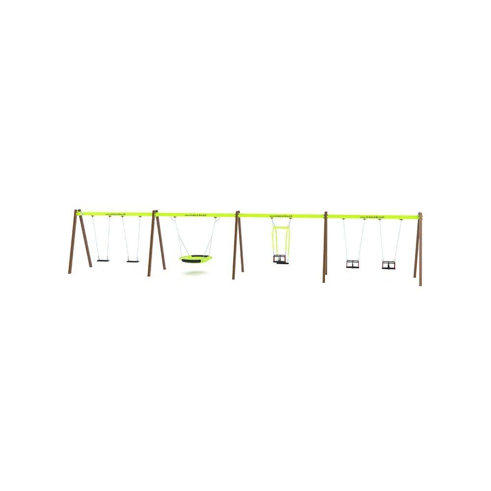Viseća ljuljačka sa svim vrstama sjedala – 2x klasična, 2x dječja sjedala i sjedalo u obliku gnezda – nadopunjena je posebnom konstrukcijom za ljuljanje majke i djeteta. Izrađena je od vruće pocinčanog čelika, koji je premazan pečenom bojom u prahu. Spojni materijali su od nehrđajućeg čelika i prekriveni su plastičnim kapicama radi povećanja trajnosti i sigurnosti.