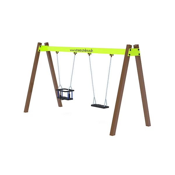 Viseća dvostruka ljuljačka s dva sjedala, klasičnim i dječjim, izrađena je od vruće pocinčanog čelika i premazana praškasto pečenom bojom. Spojnice od nehrđajućeg čelika prekrivene su plastičnim kapicama radi veće izdržljivosti i sigurnosti. Ljuljačka VVZ-VH007 certificirana je prema standardu STN EN 1176. Preporučuje se korištenje travnate prostirke kao udarne površine.