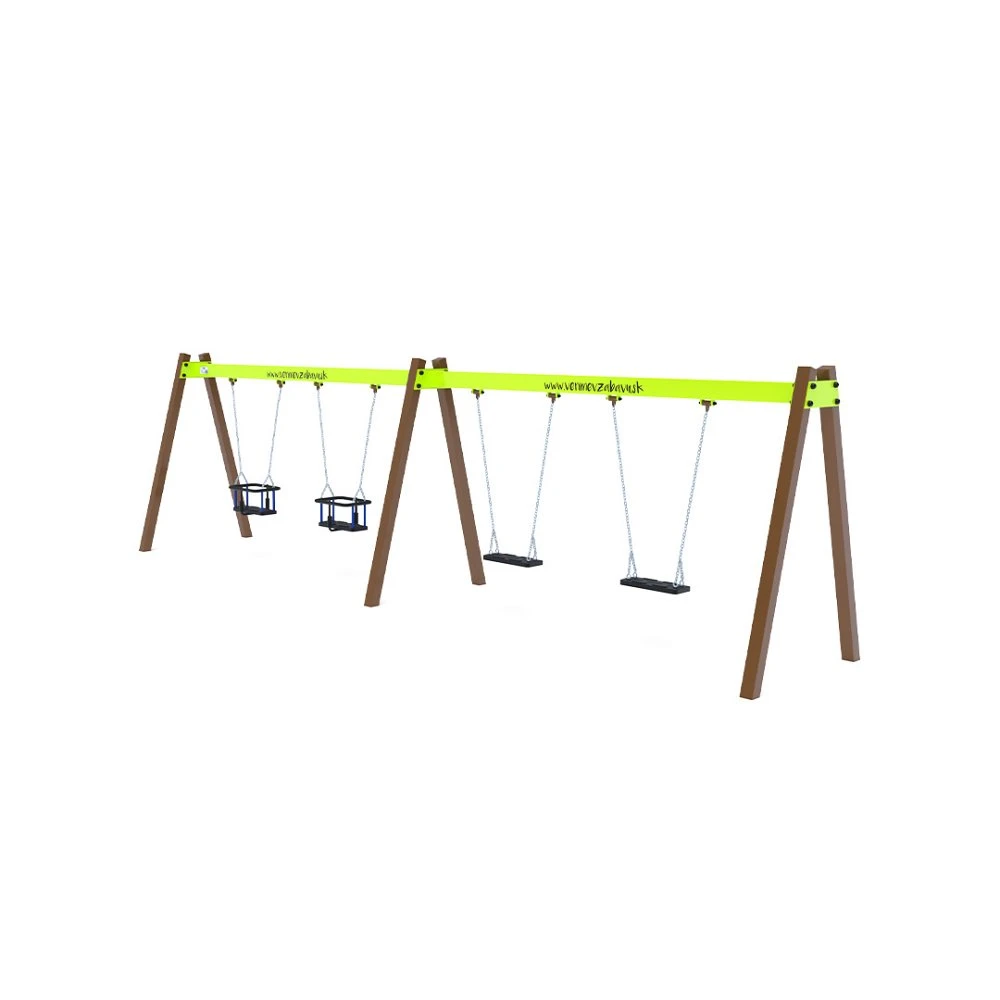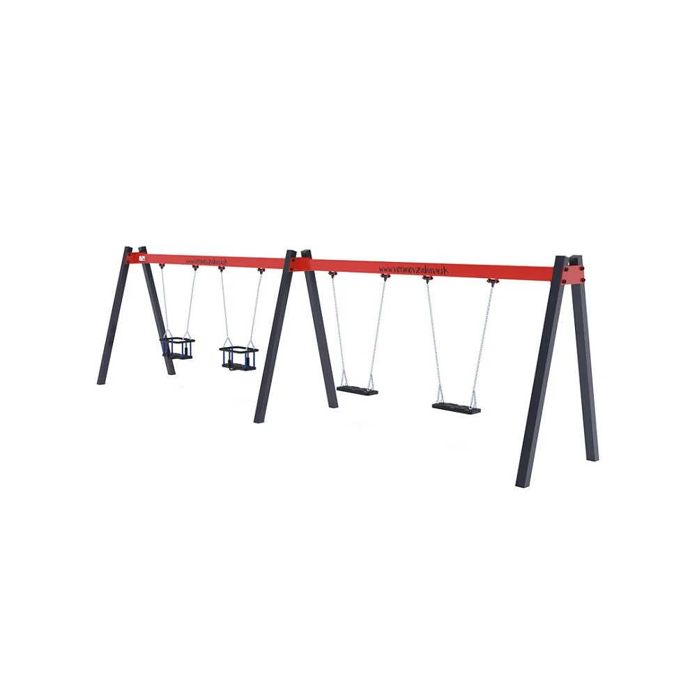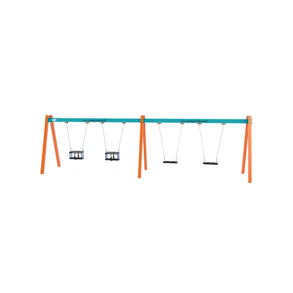 Viseća četverostruka ljuljačka sa sjedalima u konfiguraciji 2x klasična i 2x dječja sjedala izrađena je od vruće pocinčanog čelika, koji je premazan pečenom bojom s praškastim premazom. Spojni materijali su od nehrđajućeg čelika i prekriveni plastičnim kapicama radi povećanja trajnosti i sigurnosti. Ljuljačka VVZ-VH010 certificirana je prema standardu STN EN 1176. Preporučuje se korištenje travnate prostirke kao udarne površine.