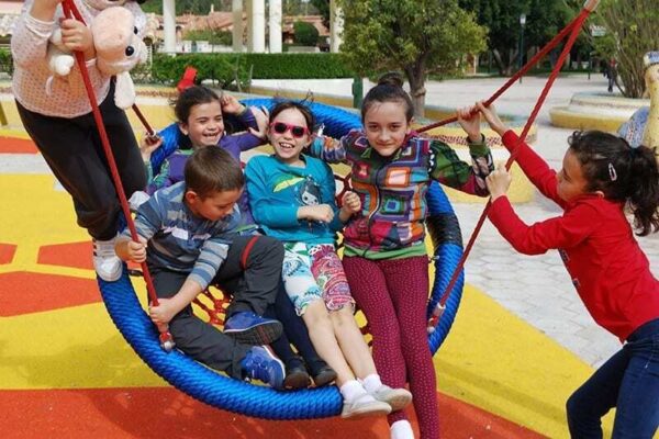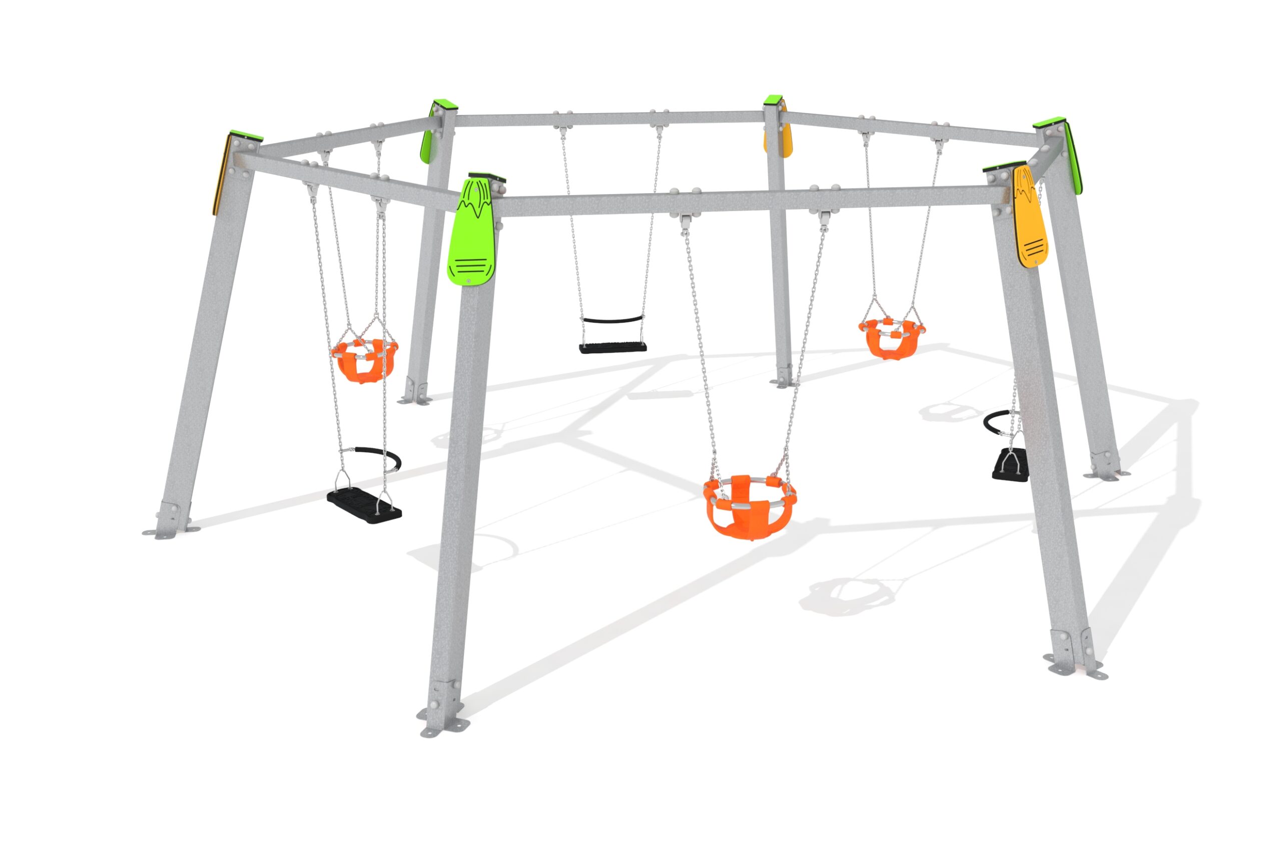 Ljuljačka s tri ravna sjedala i tri sjedala za kolijevke, gdje se mališani mogu družiti s drugom djecom baveći se jednom od svojih omiljenih aktivnosti, ljuljanjem.