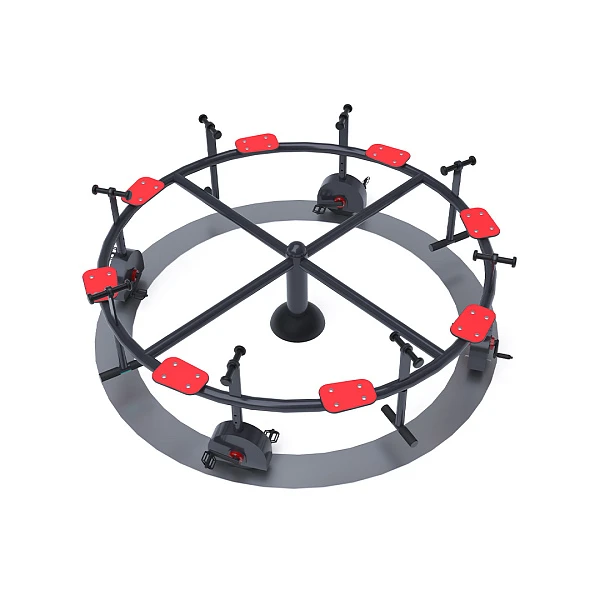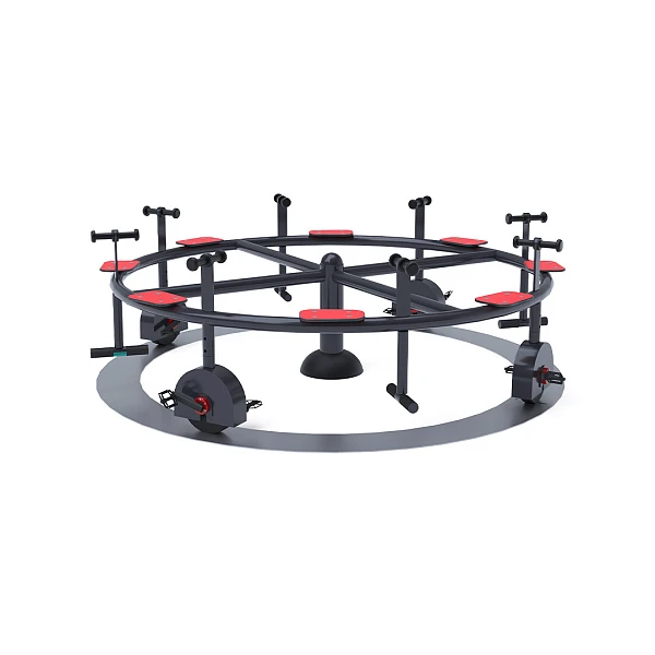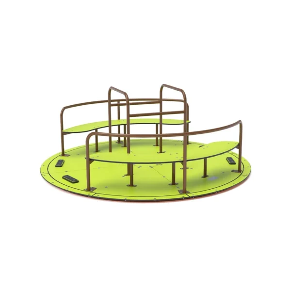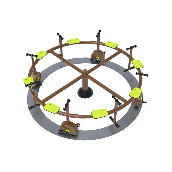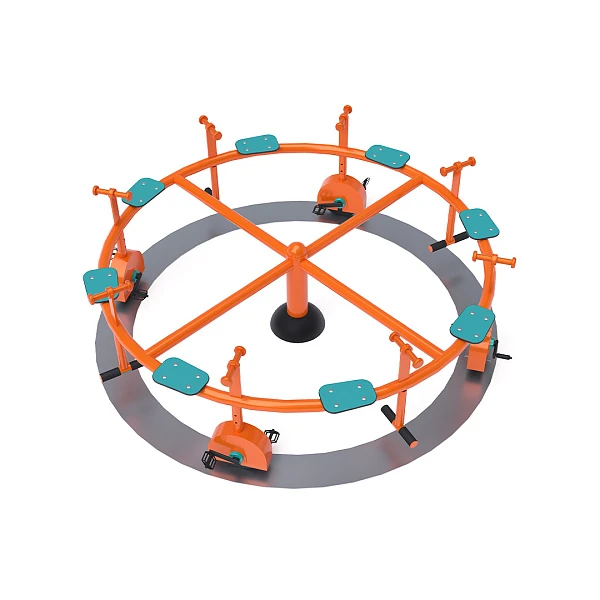 Dječji vrtuljak s pedalama i sjedalima izrađen je od vruće pocinčanog čelika, završen praškasto premazanim bojom. Dizajniran je s naglaskom na postizanje dugog vijeka trajanja i sigurnosti u radu. Sjedala su izrađena od HPL materijala, koji je kemijski otporan, UV otporan, netoksičan, reciklirajući i nelomljiv. To osigurava sigurnost djece od oštrih rubova ili fragmenata. Za povećanu sigurnost, mehanizam pedala je jednosmjeran, što sprječava da vrtuljak okreće pedale tijekom rada.